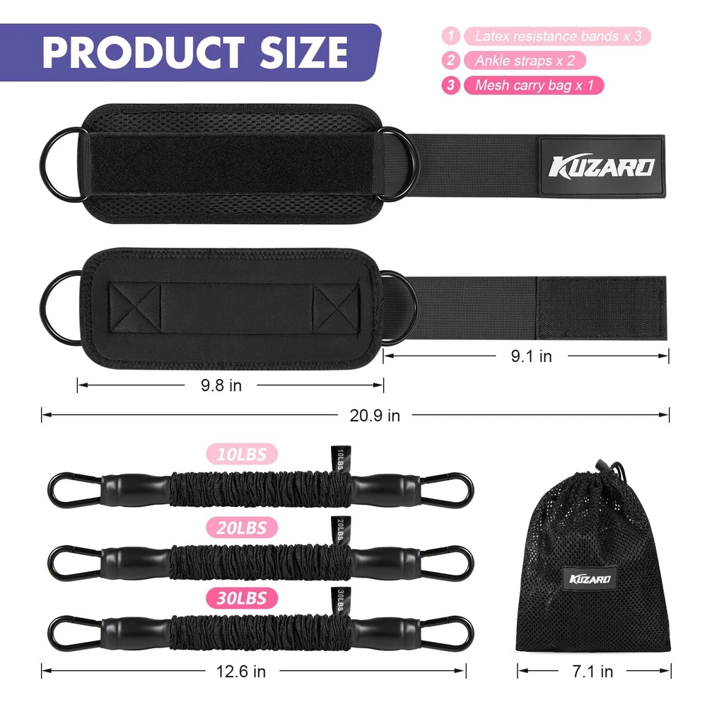 Size: Ankle Resistance Bands Set Type: Does not apply gtin13: Does not apply UPC: Does not apply Color: glossy black Brand: KUZARO Package Dimensions LxWxH: 8.39x6.69x3.43 Inches Weight: 1.06 Pounds