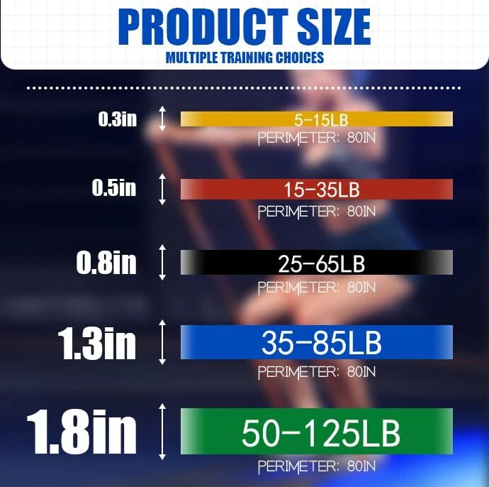 Packaging :5pcs Pull Up Bands and 1 cloth bag. The resistance bands for working out including yellow 5-15 pounds, red 12-30 pounds, black 35-70 pounds, purple 45-100 pounds, and green 50-120 pounds., Provide a wide range of versatility for beginners, fitness enthusiasts and athletes Durable:Our resistance bands are made of rubber and have a non slip surface. The workout bands have high wear resistance keeps the resistance bands intact under high pressure, ensuring safety and effectiveness during every training session Multifunctional :5 fitness belts are perfect for all fitness enthusiasts and beginners, perfect for both men and women. When traveling, you can use engage in efficient exercises in hotel rooms, such as assisted pull-up, pull-up, cross training, weightlifting, yoga, and Pilates. You can add more fitness belts or fitness belts according to your goals Portability:Our exercise bands resistance is compact, easy to store, and comes with a convenient drawstring bag for easy carrying. Whether you are at home, in the gym, or on the go, lightweight and versatile, you can exercise anytime and anywhere without sacrificing space or convenience Fitness Training:The resistance bands for working out are perfect for both men and women to exercise their arms, back, legs, and hips, and can be used for training at home or in the gym