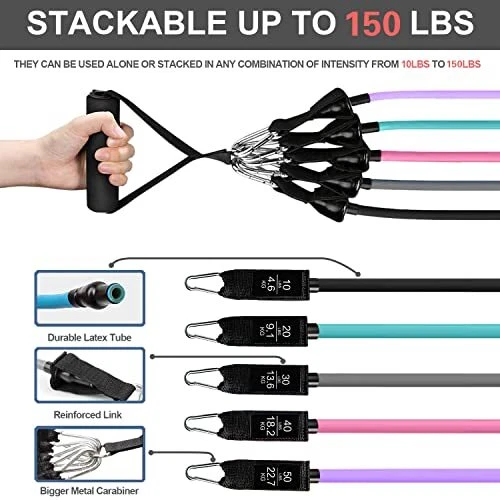 【Resistance Bands Set for Women】: Each resistance band represents a different resistance level, black 10 lbs, cyan 20 lbs, gray 30 lbs, pink 40 lbs, purple 50 lbs. Exercise bands can be used individually or stacked to achieve 150 LBS, which can help you easily adjust the resistance level required for various muscle exercises according to the intensity of different sports. 【High-quality Fitness Bands Bring Safety Protection】: These workout bands are made of environmentally friendly natural latex, with excellent durability and perfect elasticity, meanwhile harmless to your health. Steel metal buckle has stronger strength to ensure safety during use. The Soft non-slip foam handle provides comfort. The high-quality materials used in the ankle strap ensure a higher level of comfort. And the door anchor is thickened and soft, damage-free to your doors. 【Muscle Training and Fat Burning】: The exercise bands set is very effective in burning fat and increasing muscle strength. It helps you exercise your legs, hips, shoulders, arms, abdomen, chest, back, strengthen biceps, abdominal muscles, etc. It can also help you enhance coordination and enhance Endurance, flexibility. Whether you are a beginner or an experienced person, you can easily get started. 【Lightweight and Portable, Use Anytime and Anywhere】: You can use fitness bands set for yoga, Pilates, strength training and physical therapy rehabilitation. The workout bands set is portable, we will also send you a resistance band bag at the same time, you can easily transport the resistance bands suit to the gym or any training place to help you exercise anytime, anywhere, to create a perfect body. 【Quality Assurance and Excellent After-sales Service】: Our exercise resistance bands are fully tested before leaving the factory. We provide you with a 100% quality guarantee and let you buy with confidence. If you have any questions or concerns, please contact us and we will provide any help you need.