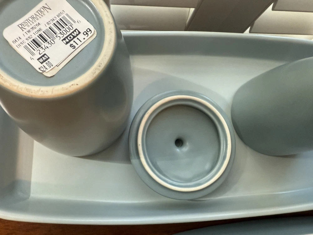 6 Piece Restoration Hardware Bath Vanity Set. The set includes a lidded jar for storing small items, tissue box cover, cup and a set of trays for displaying on your vanity top. Gorgeous clean lines and gentle edges. Two Trays: Both are 13”x6.75” Tissue Box cover is 5.75x5.75x5.50” Jar with Lid is approx 5”H Cup is 3.75”H