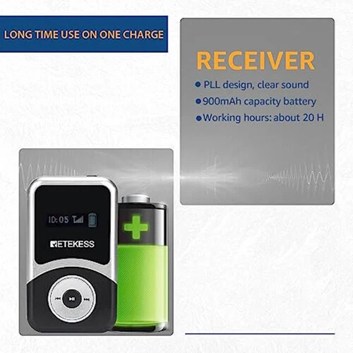 Shipping Service:Priority DHL Express Service when items ship from China.(2-7 business days) Retekess T131S Wireless Tour Guide Audio System Receiver for T130S Meeting Tour NOTE: This is wireless receiver only, it has to match our transmitter (T130S 195-216MHz,not be included in package) to build a wireless tour guide system, please feel free to contact us. Receiver Features: Portable design, the smallest and lightest PLL synthesized design, with high frequency stability 49 channel: allows 49 groups to operate simultaneously at the same place Built-in rechargeable lithium battery, make sure can use all day long LCD display, volume adjustable, battery consumption display, easy to operate Applications: Tour guide, Wireless meeting, Wireless teaching, Simultaneous interpreting, Corporate hospitality, Factory tour, Church sermon, etc.. Receiver Specification: Frequency range 195-216MHz Channel 49 channels Operating voltage DC 3.7V Audio frequency input 3.5mm line Frequency response range 50-18000Hz SNR 80dB(Typical) Image rejection ratio ≥90dB Degree of distortion <0.3% Effective working area 100m (empty) Capacity of battery 900mAh Working hours About 20 hours Size 73x 42 x 12mm / 2.8 x 1.6 x 0.5 in Weight 45g / 0.1lb Package Includes: 6 x Wireless receiver 6 x Single earphone 7 x Lanyard 1 x English manual Long working distance Signal transmission distance up to 100m/328ft, is ideal for keeping social distancing, such as tour guides, translators; factory visits; training meetings and other scenarios. The frequency range is 195-216MHz, helping tour groups overcome background noise and distance from the guide. One key to mute When the tour guide has to answer the phone during the explanation, he can turn on the mute function with one button on the transmitter instead of turning off the transmitter. PLL technology for signal stabilization PLL digital locking frequency synthesis design, more stable frequency, data mute locking technology, no interference noise. Ensures the clear and smooth audio transmission in a tour trip or in a conference. Ultra-long standby rechargeable battery Built-in 4200mAh lithium rechargeable battery in the transmitter can be used for 20 hours. Built-in 900mAh lithium battery in the receiver can be used for 20 hours. Long working time ensures your guests won’t miss any of your message,readily for a whole-day conference or journey. Wireless ID Setting Manual ID Setting We have 2 ways to set ID: Wireless ID setting and manual ID setting. Wireless ID setting works better for the occasion that if have to set the ID for many receivers, like a big conference; Manual ID setting works better for the occasion that if have to set the ID for few receivers, like a small class, a small group of tourists; Support 49 channels In the same tourist attraction, there will be multiple sets of equipment for explanations at the same time, and 49 optional channels will keep your team free from interference from other equipment. AUX and MIC dual-channel audio input The tour guide can play background music through the AUX function when explaining. Allow visitors to immerse themselves in the attractions. The clear and high-quality sound offers enjoyable listening experiences.. D-shaped earphones Compatible with left and right ears, it can reduce the burden on listeners who wear headphones for a long time compared to wearing headphones on one side. It is convenient to wear and solves the difficulty of using some hearing-impaired people, increasing the wearing options of users. Intuitive user interface LCD display for battery power, channel, volume, it is very easy to operate. The lit display design allows users to see information intuitively even in dark environments. Mini-sized The transmitter and receivers are mini-sized and light. Easily hang on your neck and it doesn’t cause neck pain even for a long-time wearing. Wireless tour guide system for a factory tour. Presenters don’t have to shout to compete with ambient noise. Tour group can adjust their own volume to a comfortable level. Make sure every visitor hear the introduction when the machines are working. About Us