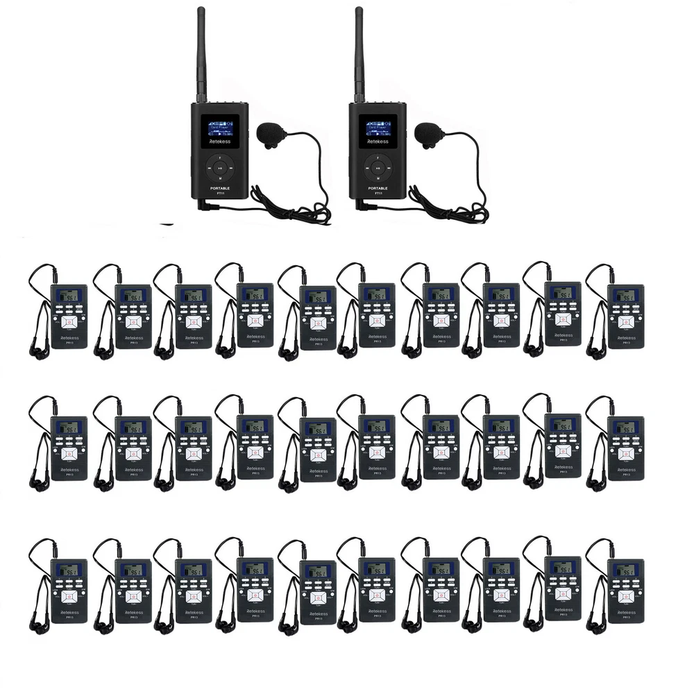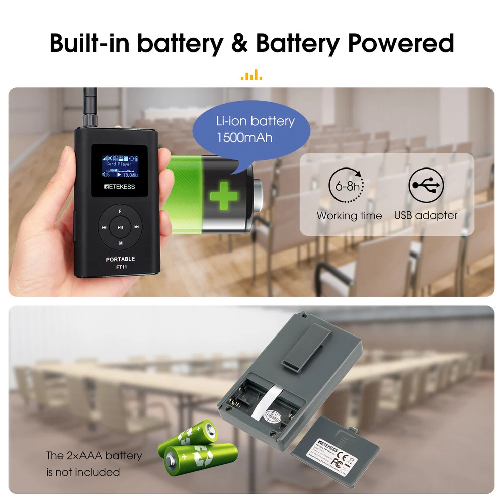 Features: Portable fashion design, good touch feelings Support transmit lossless music through the memory card and AUX input jack 3.5mm AUX input: transmit music from your smart phone, computer, MP3 or CD player Support store five commonly used transmission frequency Built-in microphone, support external condenser microphone Long press the MIC button to speak, release to end, easy to use FM frequency range 60-108MHz Automatic search and manual search the radio stations 5 station presets: you can manually store five favorite stations Press the 1-5 keys to quickly select storage station Mono / stereo selectable With 24-hour digital clock If you want to buy at more favorable price, or want to freely match the receiver, please contact customer service Shipping Service:Priority DHL Express from China to deliver item(2-7 business days) The frequency range of the transmitter is 76~108MHz. The frequency range of the receiver is 60~108MHz. You can adjust it according to your need when you listen to music or talk show. The transmission distance of the transmitter is 50-80m. You can clearly hear the introduction of the tour guide, even you fall behind the team. (Note: The actual transmission distance is affected by the environment and the battery status). With 5 stations preset, you can save stations that you like. You can easily use the TUN button to manually or automatically search stations. It is convenient to immediately reach and listen to the preset station you like with the number key. FT11 With built-in 1500mAh battery, the transmitter can continually work for 6-8 hours. No frequent charging matter, it is efficient to support a long-time conference. The battery powered receiver is convenient to use and can be easily taken with you anywhere. (Note: 2×AAA battery is not included). You can save some anecdotes of tourist attractions on your phone or TF card in advance. When travelling, you can share them with tourists through the AUX cable and TF card. (Note: The AUX cable and TF card are not included). The receiver supports mono sound and stereo sound. Mono sound offers you a louder sound. Stereo sound brings you an immersive listening experience. You can select as needed. With built-in microphone, the pastor can walk freely in the church when speaking. The external microphone can be clipped to the collar to free your hands. (Note: The wired microphone is included). The earphones are used as the antenna. Adopting DSP technology, the receiver is efficient to reduce noise and transmit clear audios, offering an enjoyable listening experience. It is efficient to prevent the receiver from changing current frequency and volume with the lock switch. You don’t need to worry about affecting worship or meetings. The volume is adjustable. In a worship or a conference, you can adjust the proper volume with button to ensure you can clearly hear the sound. FT11: Size: 99 x 58 x 15mm / 3.9 x 2.2 x 0.6 in Weight: 80g / 0.17lb PR13: Size: 92 x 54 x 15mm / 3.6 x 2.1x 0.6in Weight:40g / 0.09lb Adopting DSP technology, visitors can hear the clear sound transmission when machine are working. Prayers can easily finish a-long-time worship and don’t feel tired with lightweight and portable radio. Falling behind the team, tourists can clearly hear the sound. Wherever attenders sit, they can clearly hear the meeting contents through their earphones. Solution Introduction: This simultaneous interpretation solution is achieved as follow: the voices are transmitted via transmitter's(FT11) microphone to interpreters and corresponding listeners equipped with receiver( PR13). Then they are interpreted into different languages and transferred to receiving apparatus(PR13) by means of transmitter's microphones outfitted for relative audience's listening. Application Scene: This simultaneous interpretation solution caters for following event: forum speech, academic exchange, product launch, business celebration and so on, depending on product specifications and features. Solution Features : To recommend utilization on a small meeting Operating range: max. 100 m (indoor) Portable apparatus, making it convenient to carry and conserve very easy to set and operate Slim, making it comfortable to wear Composition of simultaneous interpretation solution: transmitter + receiver Note: If this solution cannot meet your demand, please contact our Customer Care Center and we will customize your product according to your requirements. Reminder: Please inform us of your application scene, environment, product quantity and other relative information in order to provide better service for you. Main Product Specifications : Transmitter Channel Number 5 CH Frequency increase 0.1MHz Pre-emphasis 50us/75us Output impedance 50 ohm SNR >=70dB Frequency response 30Hz~15000Hz Support mp3 format FLAC, WAV, WMA, MP3 Support memory card Max 32GB Power Built-in 2000mAh polymer lithium battery Working hours 6-8 hours Charge DC 5V 1A, Micro USB jack Size 99 x 58 x 15mm / 3.9 x 2.2 x 0.6 in Weight 80g / 0.17lb Radio Sensitivity <3.5uV Signal to noise ratio 45db Stereo separation 32dB Power supply 2 x AAA batteries (not included) Earphone jack 3.5mm Tuning increase 0.1MHz Built-in speaker No Dimension 92 x 54 x 15mm / 3.6 x 2.1x 0.6in Weight 40g / 0.09lb Package Include: 2X Transmitter 30X Receiver 30X In-ear earphone 30X Lanyard 2X USB charging cable 2X Wired microphone Hand strip English manual About Us