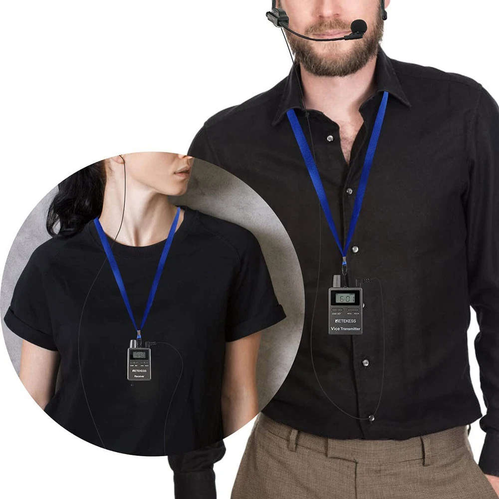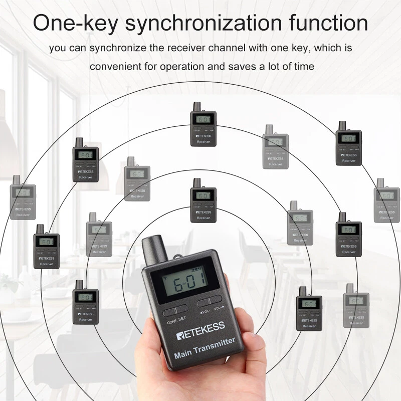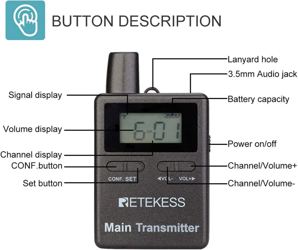 无标题文档 Shipping Service:Priority DHL Express Service when items ship from China.(2-7 business days) TT105 2.4GHz Professional Wireless Tour Guide System for Traveling Museum Visit Conference Features: 2.4GHz signal transmission with stable audio quality Two-Way communication: allowing two speaker speaking at the same time One-key Receivers channel synchronization function saves much time 150 meters communication distance in the open air 50 channels to choose, up to 50 groups tour at the same location Built-in rechargeable lithium battery, long battery life Pocket size and light weight, easy to use Description: Dual speakers TT105 tour guide 2 way receiver system supports two transmitters in a group talking to each other, at the same time, all receivers can clearly hear what the two transmitters are saying, suitable for two tour guides' trips, double-hosted meetings, or factory tours. (Note: the secondary transmitter cannot be used alone) Long-range two-to-many mode The communication distance between the two-way transmitters is 328ft/100m and between the transmitter and receiver is 492ft/150m. Two presenters can communicate in both directions 100m apart and their listeners can listen to the message clearly at a range of 150m from them. MIC input and AUX input Microphone port can be used as an AUX port, you can use a 3.5mm AUX cable to connect the transmitter and audio device for audio transmission, so your visitor or listener can hear music or other voice files from an external audio device. Long standby time TT105 dual-speaker wireless tour guide system has a built-in rechargeable lithium battery with long battery life. When fully charged, the transmitter can be used continuously for 10 hours and the receiver can be used continuously for 12 hours. You don't need to charge it frequently, and you don't have to worry about the device running out of power and affecting the tour activities. 2.4G universal frequency Tour guide 2 way receiver system uses 2.4G universal frequency, you can use it all over the world. And the 2.4G transmission signal is more stable, private, and noiseless, with crystal clear sound, so your visitors can enjoy a comfortable narration process. Volume adjustment The two transmitters have a volume level of 0-4, and the receiver has a volume level of 0-9. The listener can freely adjust the desired volume with the volume adjustment buttons. If you use it for noisy outdoor tours, or factory visits, or if you have hearing-impaired listeners, the wide range of adjustable volumes will definitely help you. Automatic channel synchronization Just one step to set all transmitters and receivers on the same channel. Easy to operate, it only takes ten seconds to complete the pairing. Save time, you don't have to adjust the receiver's channels to the same one by one. Portable dual-speaker tour guide system The main transmitter and vice transmitter weigh 60g and the wireless receiver weighs only 51g, lightweight and small size, users won't feel discomfort when wearing them because of the heavy equipment. This also makes it easy for you to carry a tour guide system anywhere you go. Add receivers As your team expands, you can add as many receivers as you need. The newly added TT105 receiver can be paired with the TT105 transmitter and work together. That means you can purchase as many transmitters and receivers as you like, and we have a variety of combinations to meet the needs of different teams, as well as 32-port and 40-port charging cases for you to choose from. If you have other quantity combination needs, contact us to get them. Comfortable accessories Main transmitter and vice transmitter with headset microphone, the host can hang it on the ear, and the microphone position from the mouth can be adjusted at will to achieve better noise reduction and clarity. Receiver with ear-mounted single-sided headphones, comfortable to wear and not easy to fall off, even if the team is on the march, the microphone and headphones will not fall off. Specification: T ransmitter Frequency range 2400-2480MHz Channel 50 channels Output power 10mW Power supply Built-in 1500mAh lithium battery Working time About 10 hours Working distance 150 meters (open air) Size 84 x 49 x 19mm Weight 60g Receiver Frequency range 2400-2480MHz Channel 50 channels Power supply Built-in 1000mAh lithium battery Working time About 12 hours Size 84 x 49 x 19mm Weight 52g Package Includes: 1 x Main transmitter 1 x Vice transmitter 20 x Receiver 2 x Microphone 20 x Single earphone 22 x Charging cable 22 x Lanyard 1 x English manua About Us