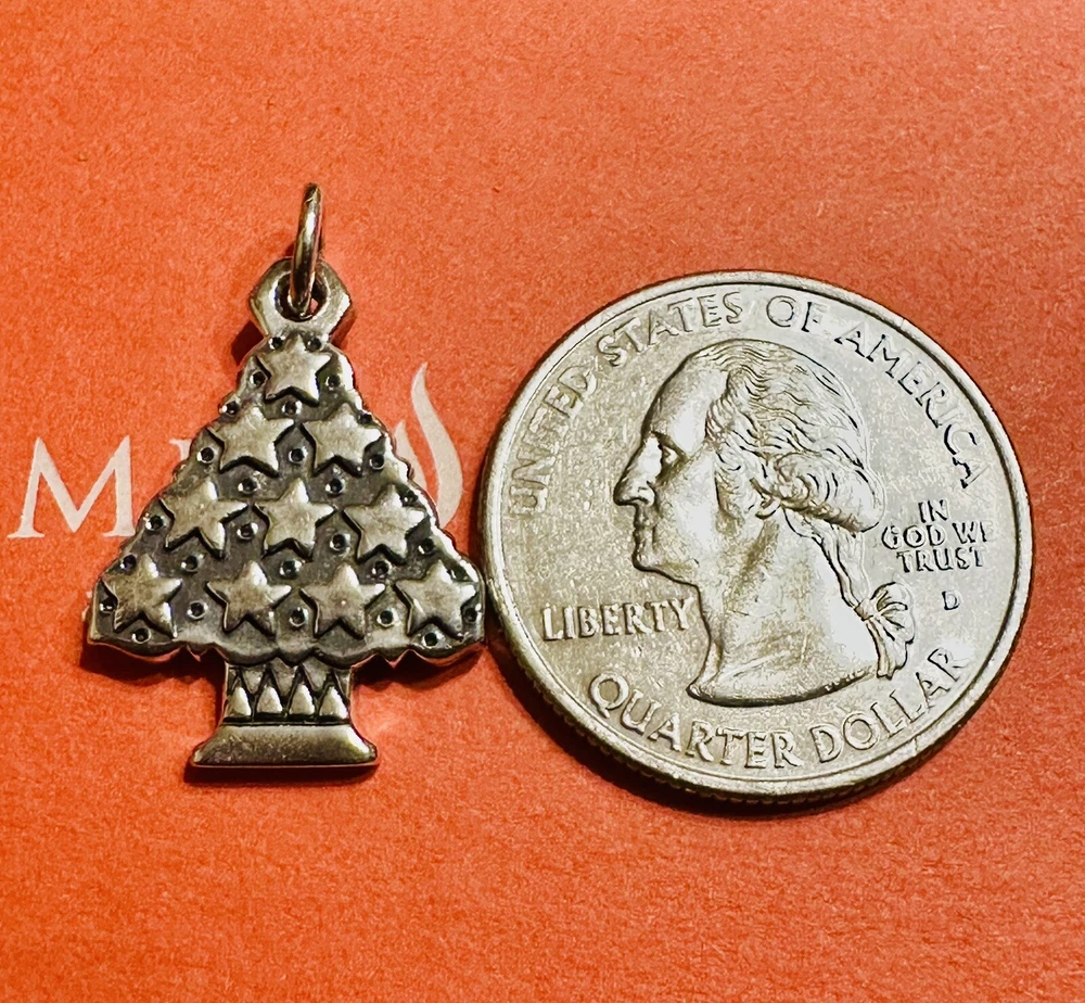This is a retired James Avery charm in the shape of a Christmas tree with stars. It is made of 925 sterling silver and does not have any stones. The charm is perfect for adding a festive touch to a bracelet or necklace.