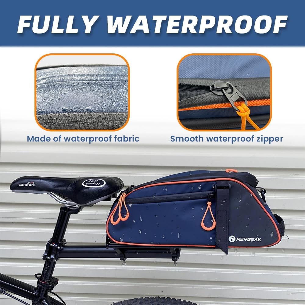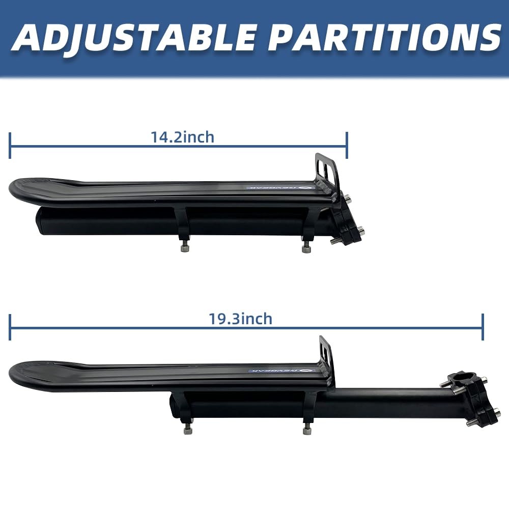 Introducing our premium Bicycle Rack Set, a comprehensive solution for enhancing your cycling experience. This set includes an aluminum Bicycle Cargo Rack and a reflective Bicycle Bag, designed to provide both functionality and safety. The Bike Rack is crafted from high-quality aluminum alloy, ensuring durability and lightweight performance. The Bike Trunk Bag, made from 600D Oxford fabric coated with a high-quality PU film, offers robust protection and waterproof capabilities. The Bike Rear Rack, weighing 7 kg (15.5 LB), features a frame length of 13 inches (33 cm) and a width of 4.5 inches (11.5 cm), with a mounting bracket suitable for seat tube diameters ranging from 27.2 mm to 31.8 mm (1.1-1.3 inches);The size of the bike rack bag is 15 x 6.3 x 6.3 inches (length x width x height);The main compartment can store wallets, mobile phones, cycling tools, travel clothing, water bottles, food, maps, etc; the bike rack bag has two side pockets, one With two top pockets and two mesh compartments, you can organize and store your must-have items reasonably;The zipper of the bicycle reflective bag adopts high-quality waterproof zipper to prevent rainwater from penetrating; excellent workmanship and durable;Our purpose in providing this bicycle rear rack bag set is to save the trouble of choosing and provide customers with a convenient and high-quality comprehensive bicycle storage solution. High Quality Luggage Rack:The bicycle carrier rack is made of high-quality aluminum alloy, which is very sturdy and durable, can bear more weight and is not easy to damage;The surface is coated with a smooth waterproof coating and equipped with stainless steel screws to prevent it from being affected by bad weather such as rain Load capacity and dimensions:The maximum load-bearing capacity of the bicycle rear frame is 7 kg/15.5 LB(Static), which can help you transport various luggage easily;Note: Load capacity will decrease as the length increases;Frame length 13 inch/33 cm, width 4.5 inch/11.5 cm, mounting bracket is suitable for seat tube diameter 27.2-31.8 mm/1.1-1.3 inch HIGH QUALITY WATERPROOF MATERIAL:The bike trunk bag is made of 600D Oxford fabric, coated with high-quality PU film, which is not only rainproof but also easy to clean; the zipper is made of high-quality waterproof zipper to prevent rainwater from penetrating; well-made and durable Stable and Easy to Install: This bicycle trunk bag comes with Four adjustable Velcro straps, which can be securely mounted on the bicycle frame in seconds without any tools, and the two Velcro straps on the front perfectly fit the fixing holes on the front of the bicycle frame to ensure firmness Best choice as a Present:This set includes a bicycle rear rack and a reflective bicycle rear camel bag, both of which fit perfectly together, helping you save time in choosing;It is the best choice as an anniversary or birthday Presents