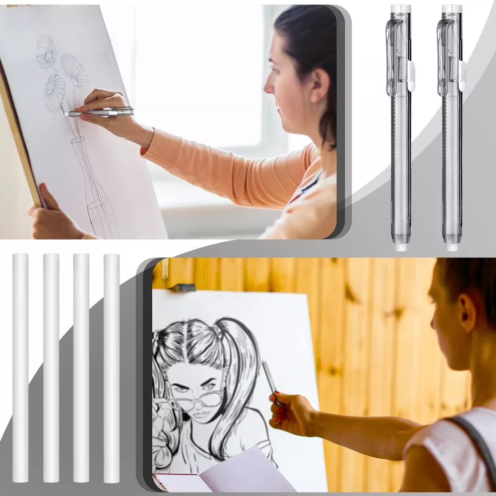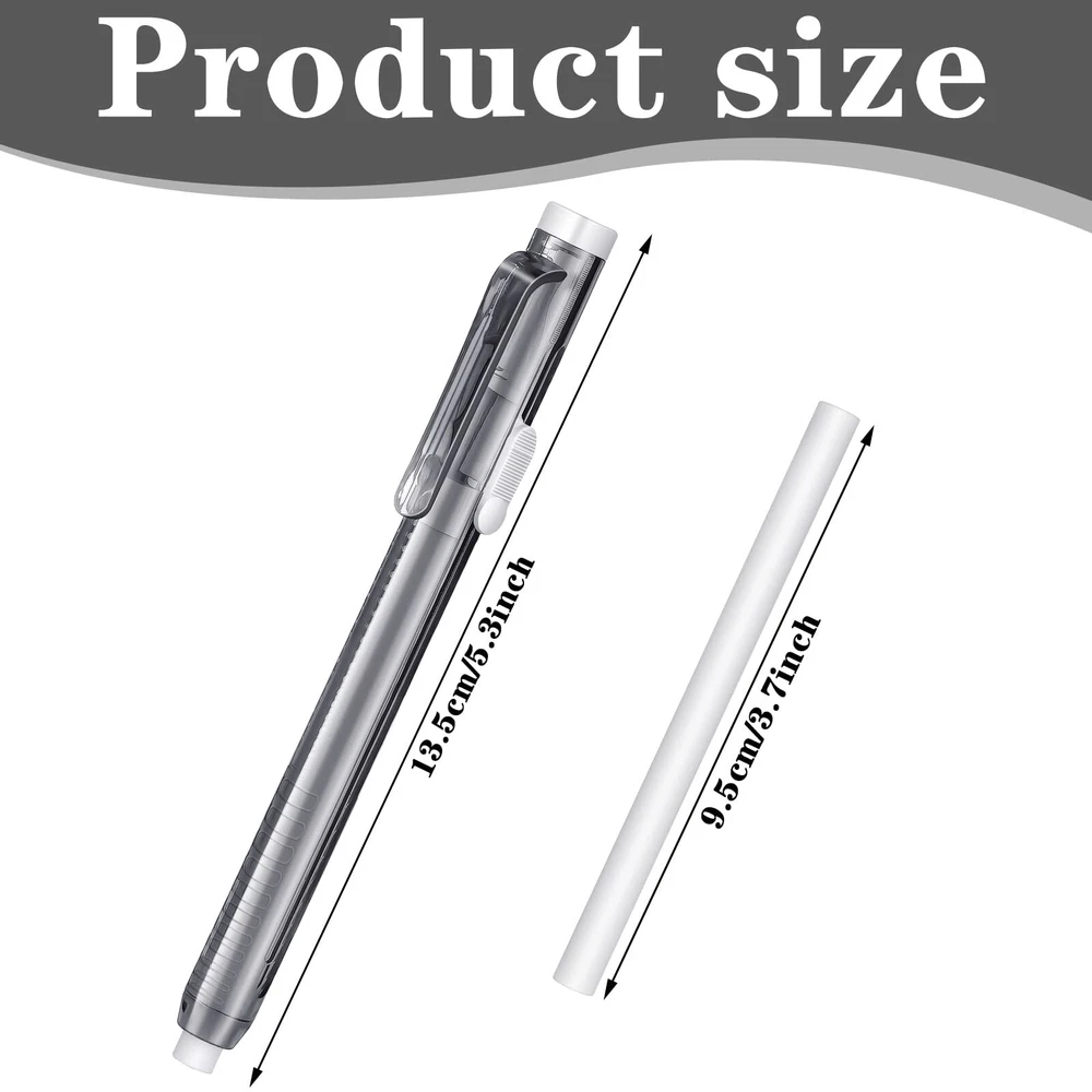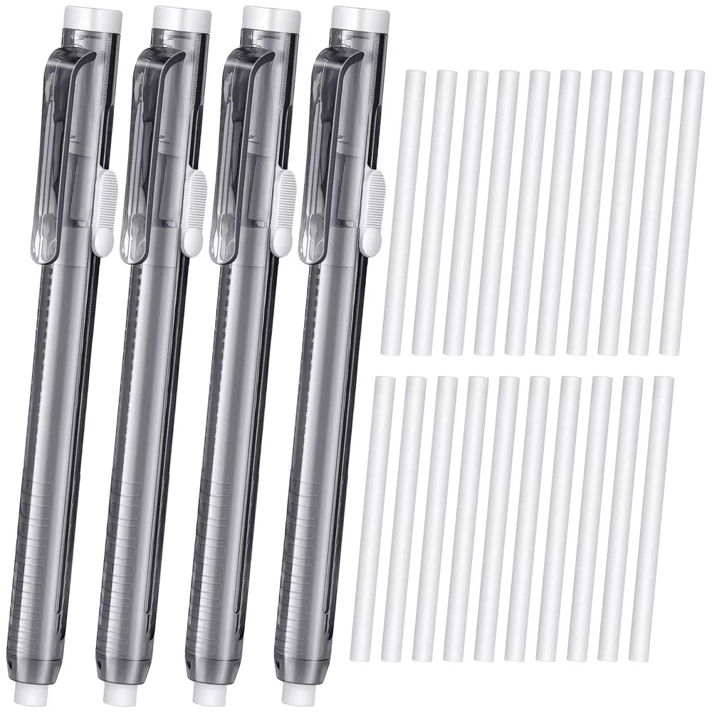 Features: Portable design: The retractable eraser refills and mechanical erasers have portable design, easy to use and store, you can also use them in different places. Considerate presents: If you have friends who need retractable eraser and refills set in the daily life, you can give them ours, your friends will like these gifts and feel happy. Specifications: Main material: plastic Color: as shown in the picture Size: as shown in the picture Package includes: 2 x Retractable erasers 10 x Retractable eraser refills Notes: Manual measurement, please allow slight errors on size. The color may exist slight difference due to different screen displays. Package Information: you will get retractable eraser and refills set, including 4 pieces of retractable erasers and 20 pieces of retractable eraser refills, totally 24 pieces; Sufficient quantity will meet your using needs Easy to use: our retractable mechanical eraser pen is light and small, easy for you to hold, and you can carry it to other places conveniently; Useful and practical in your daily life Reliable Plastic Material: the retractable mechanical eraser pen is mainly made from quality plastic material, sturdy and safe, not easy to break or fade, which will serve you for a long time Pen Style Design: our mechanical erasers are designed in pen style, can be retractable, so our erasers don't stain easily and can be stored easily, which is also convenient for most people to use Wide Range of Applications: you can use these pen style erasers in various occasions, like home, office, meeting, party, activities, etc., and they can be applied for workers, engineers, painters and others