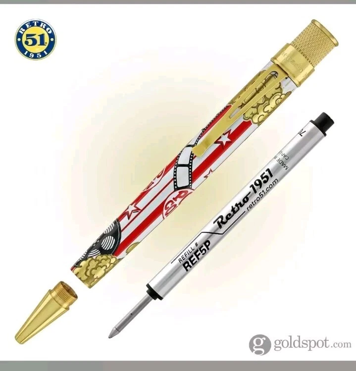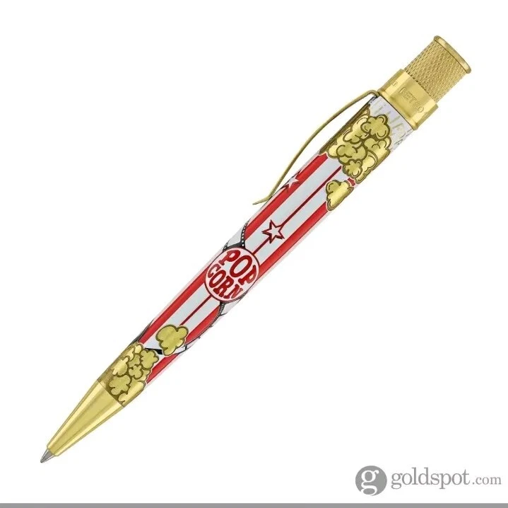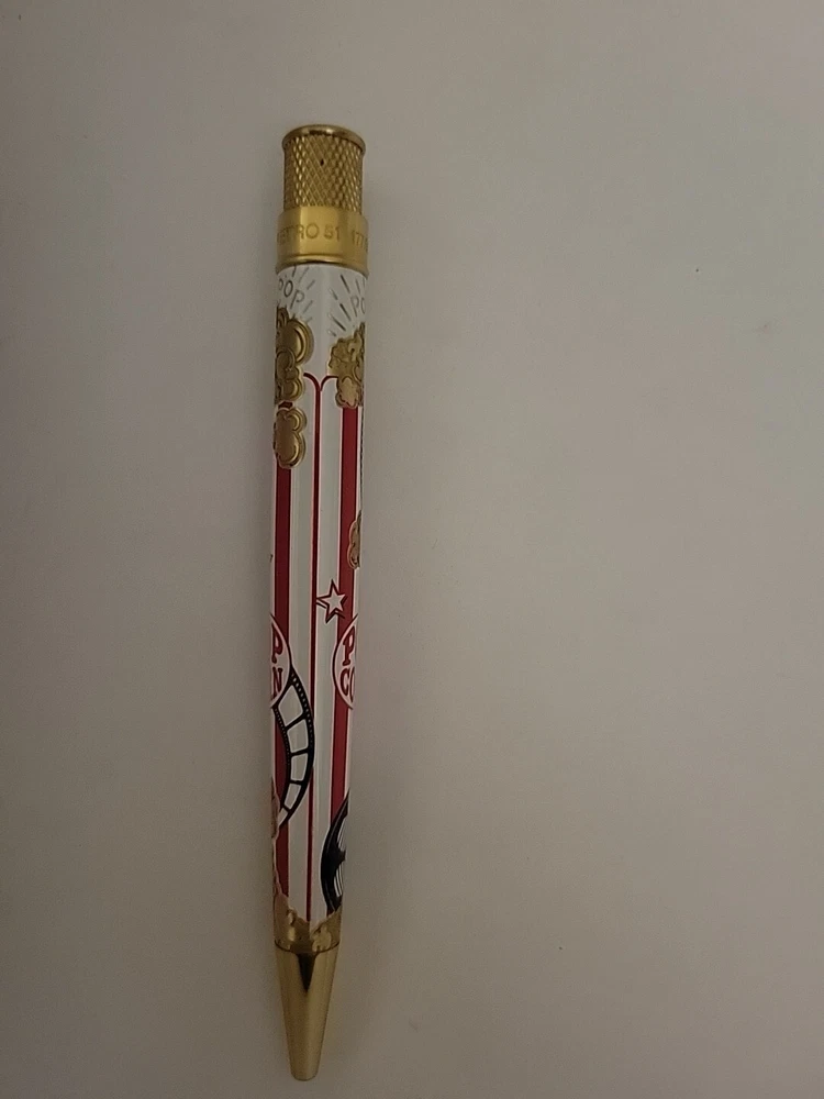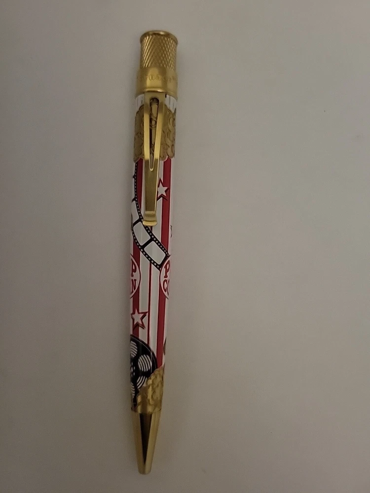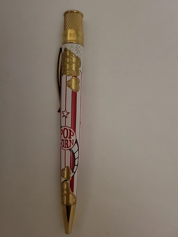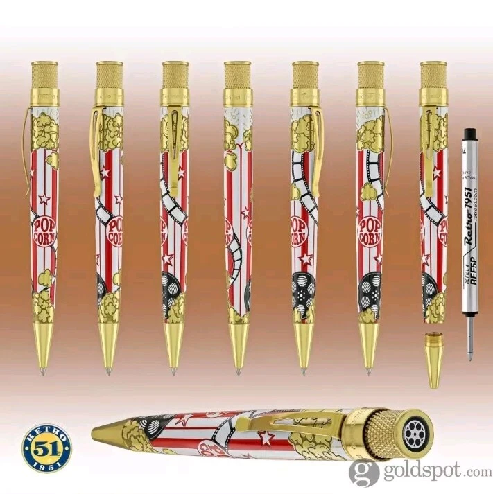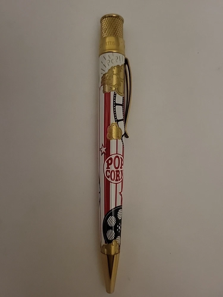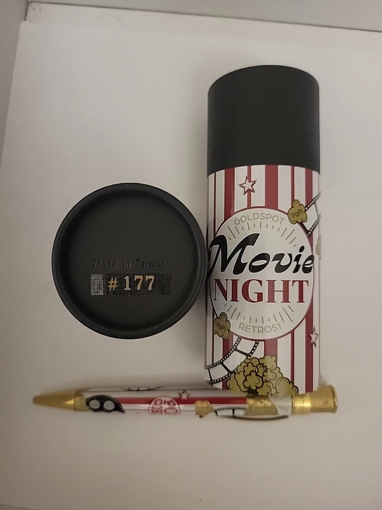 Sealed, new in box. Numbered: #177 Pictures are from the goldspot website and actual item for sale. From a collectors inventory. No marks or blemishes. Goldspot description: Goldspot - Movie Night Rollerball SKU ZRR-2331 It’s Movie Night! Walk the red carpet with Retro51 and Goldspot to celebrate the premiere of this new pen. Whether you watch in the movie theatre or stream movies at home, this new Goldspot Design Your Own Tornado Art Contest winner by Alice Manners will be the star of your collection. With a talented cast highlighted by the leading performer, the acid-etched popcorn, and the colors serving as support, this ensemble brings a new flavor to your collection. Buttery, salty, or cheesy this rollerball brings the magic of the silver screen to your writing experience. Curl up with a blanket, popcorn, drink, and a notebook to write you own story. Craft your acceptance speech, knowing you won’t be played off the stage, with this new movie themed pen.