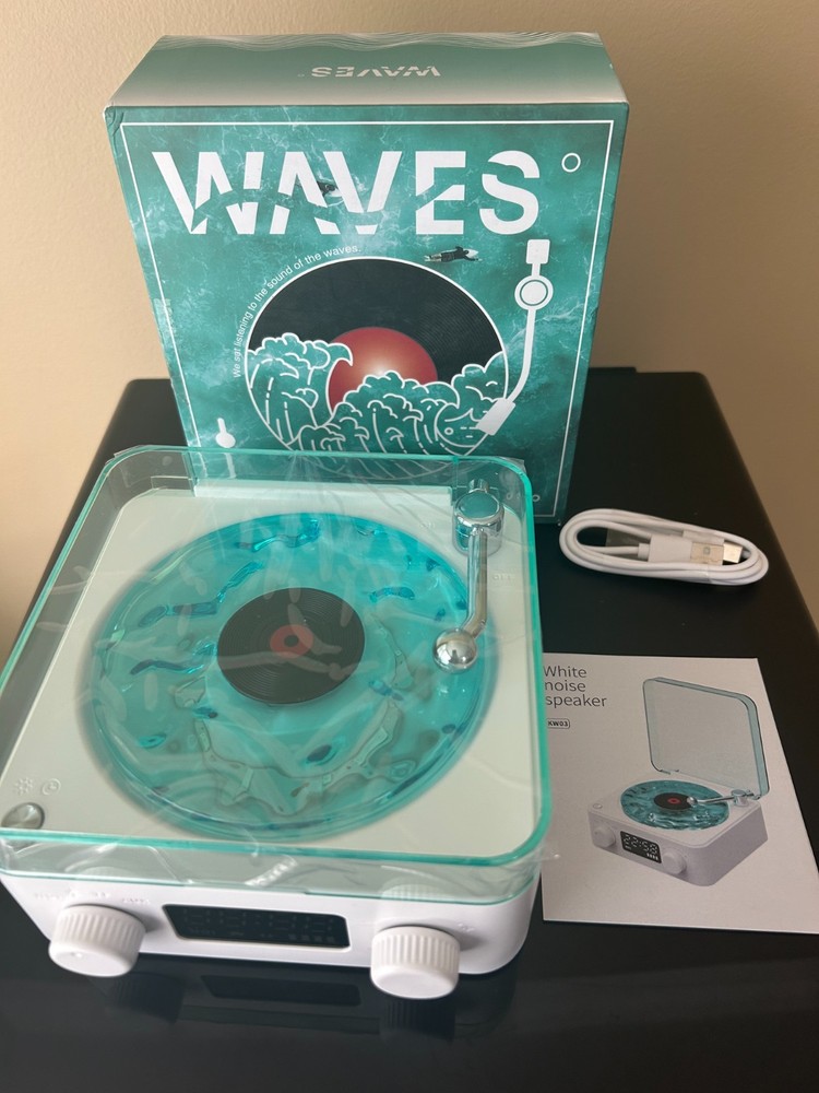 The Waves Vinyl Player Bluetooth Speaker in white is a retro-inspired turntable with modern technology. This portable speaker system connects via Bluetooth for a seamless listening experience. Its sleek design, USB audio input, and plastic construction make it a stylish and convenient option for playing your favorite music on the go. The brand's focus on delivering high-quality sound in a compact form makes this speaker a great choice for music lovers looking for a retro feel in a contemporary package.