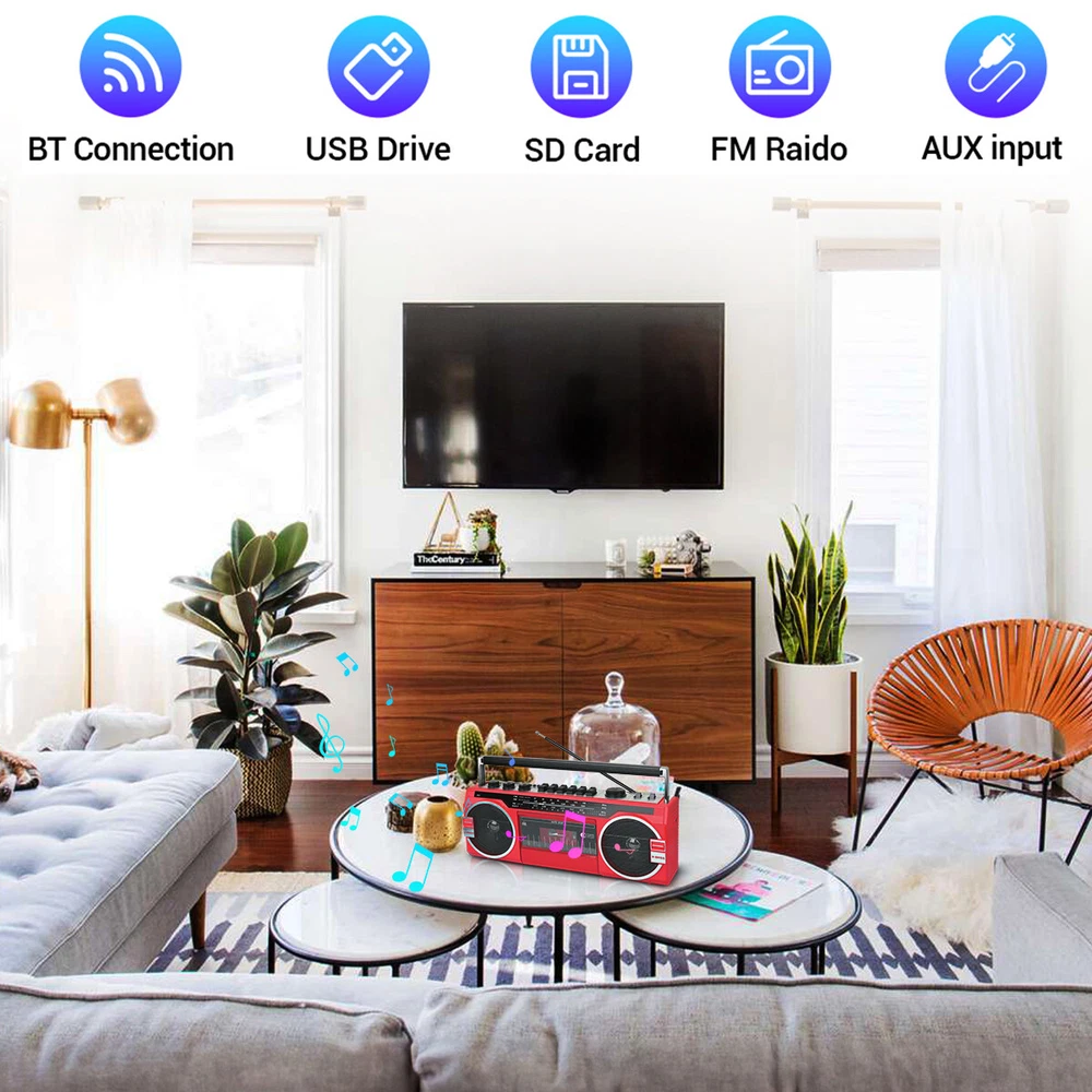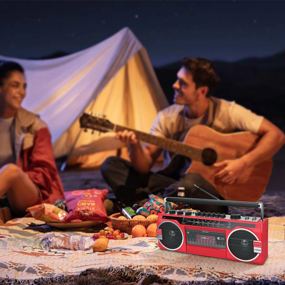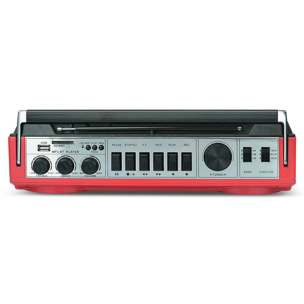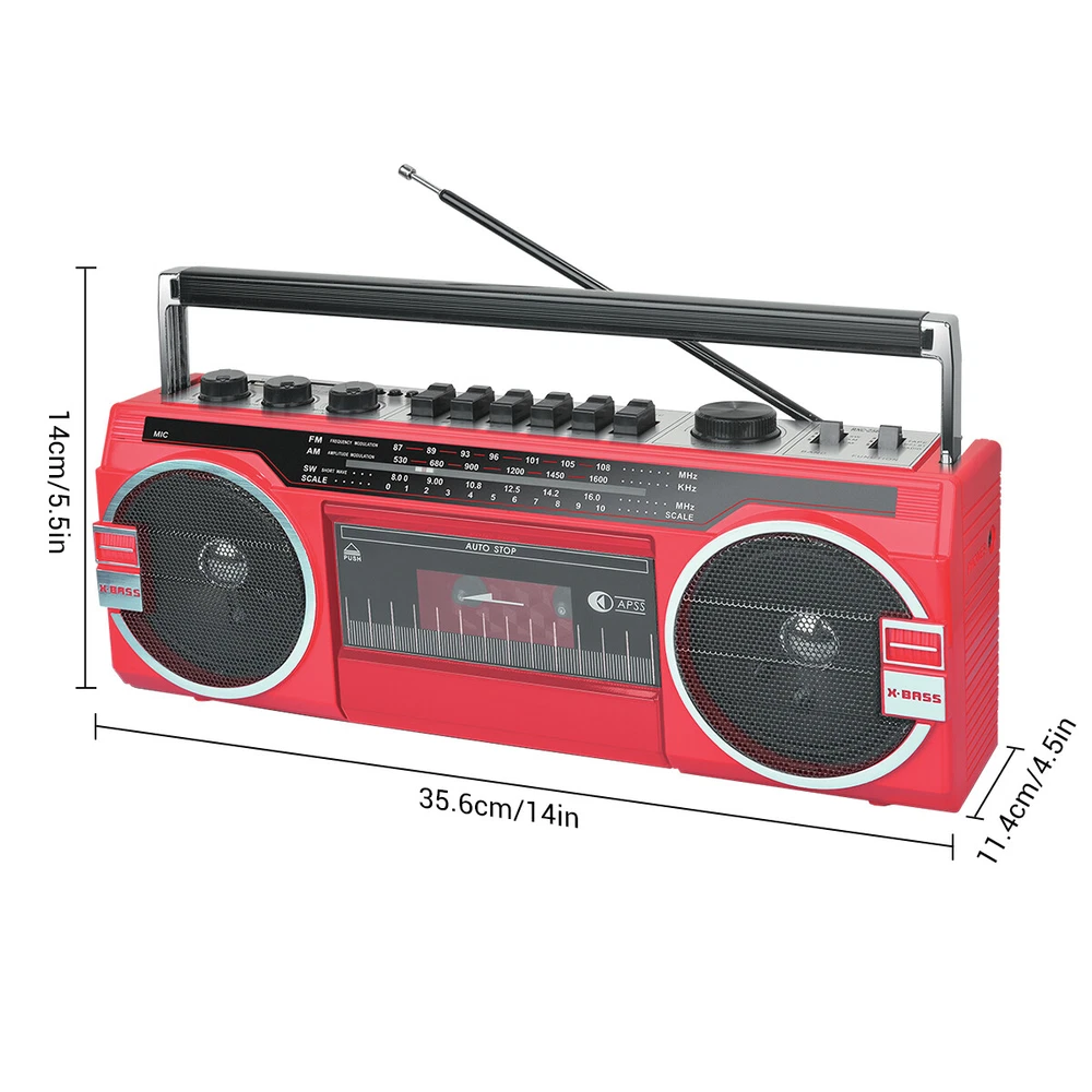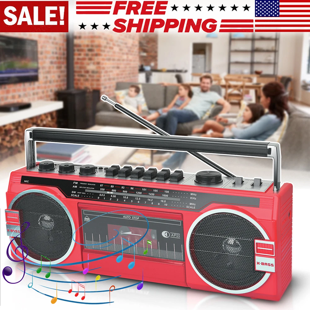 Retro Boombox Cassette Player Recorder AM/FM Radio Bluetooth Way Speaker System Features: AM/FM/SW World Band Receiver & MP3 Playback. Bluetooth wireless connection Compatible allows you to connect to most external Bluetooth wireless enabled devices. Built-in USB Input Compatible, Play Music from a USB Flash Drive. Built-in SD Card Slot Compatible allows you to Play Music from an SD Card. Cassette Player. Built-in Speaker. 3.5mm Stereo Earphone Jack. 4x D-Cell Battery Compartment for emergencies or on the go use Specifications: Material: ABS Color: red Bluetooth Name: RXC-25BT Box Recorder/Player with Built-in Condenser Microphone AC Power Supply: 120V DC Power Supply: 6V (4x D batteries) Power Output: 10 RMS watts With Condenser Microphone FF/REW/REC function Functions: Bluetooth, USB, SD, FM, AM, SW or AUX mode Package Includes: Retro-style Multifunction Radio Bluetooth Speaker AC Cable Shipping Payment Return & Refund policy Feedback Customer Support - Contact Shipping FREE SAME BUSINESS DAY MONDAY- FRIDAY SHIPPING FROM USA. All orders and payments received before 4PM EST (1PM PST) will be shipped the same business day. All other orders within 1 business day. No shipping on Weekends or US Public Holidays. No responsibility for any custom duty Shipping information will be updated when available. Payment We accept payment via PayPal. Use PayPal at checkout to pay with credit or debit. Immediate payment is required. Shipping will be arranged within 1 business day once payment is cleared. Return & Refund policy 1.We stand behind our items and offer 60 days warranty. All items are in new and working condition unless specified otherwise elsewhere in the description. 2.All Returns - defective or otherwise - MUST BE PREAUTHORIZED to guarantee refund or exchange. Please contact us to get an authorization and return address. 3.Buyer agrees to pay for the cost of re-shipment for undeliverable or wrong addresses. 4.Buyer is responsible for Return Postage as well as a 20% restocking fee if return/replacement is not a result of our mistake such as wrong item. 5.Replacement or Refund will be made upon receipt of the returned item. Please include tracking number so we can process ASAP. If you do not wish to wait for a replacement, please repurchase the item. 6.ALL REFUNDS will be processed via PayPal. Please double check via PayPal history and transaction for confirmation. PayPal will send it back to whatever you used to pay within 3-5 days. Feedback We strive to provide the best products and services. If anything about your transaction did not meet expectations, please CONTACT US and give us the opportunity to make things right. We are always here to help. Customer Support - Contact Please do not hesitate to CONTACT US. You can message 24/7 on eBay for all questions and inquiries. We will get back to you within 1-2 business days at the latest.