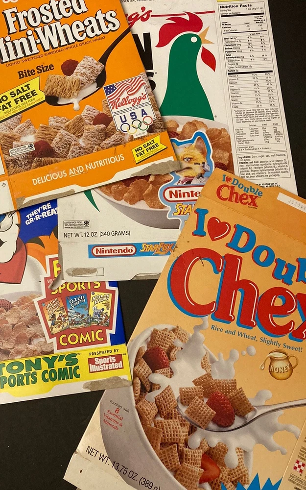 These 4 retro flattened cereal boxes are true timepieces, stamped with history. They’re not just dated cereal boxes—they feature advertising that reflects the events and pop culture of the time, like the Olympics and Nintendo. These boxes were part of the cereal we actually ate and saved, making them even more special. While they are in excellent condition, please note they are older and may show some signs of wear due to age. A rare and collectible set that captures the essence of the past!
