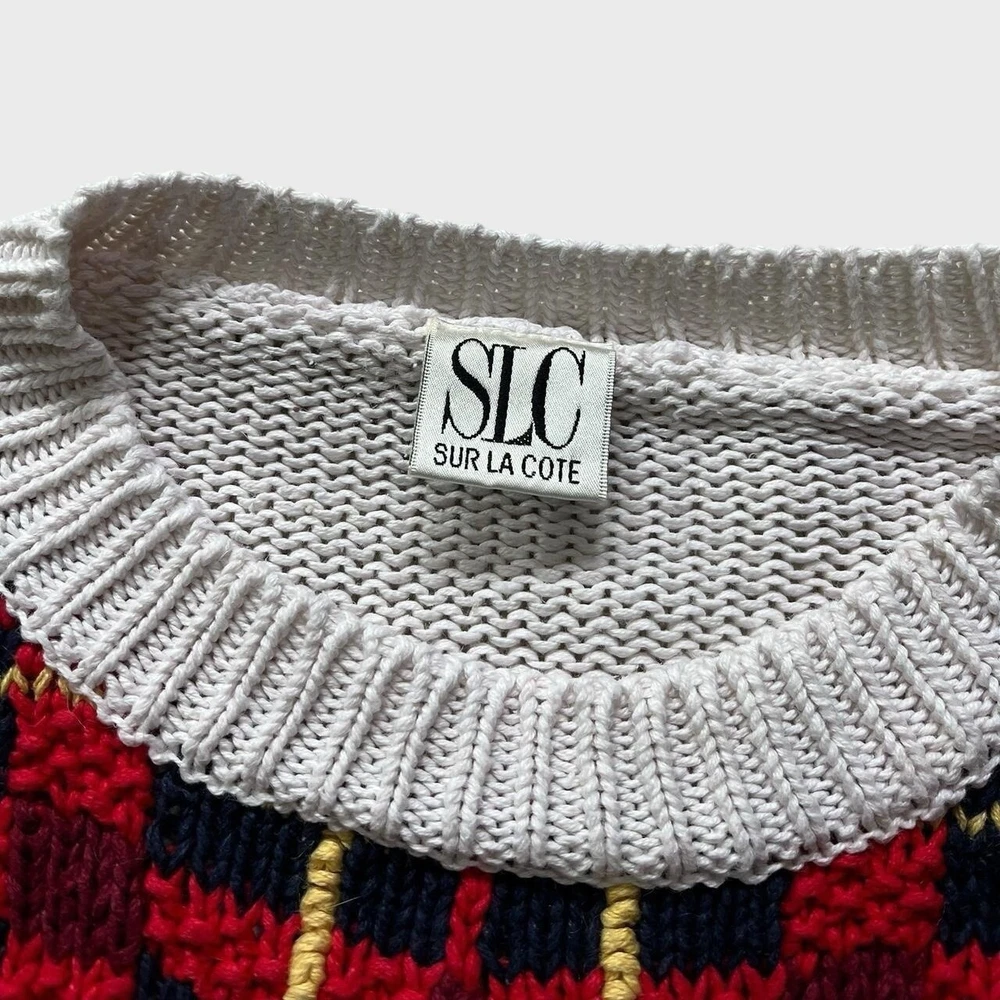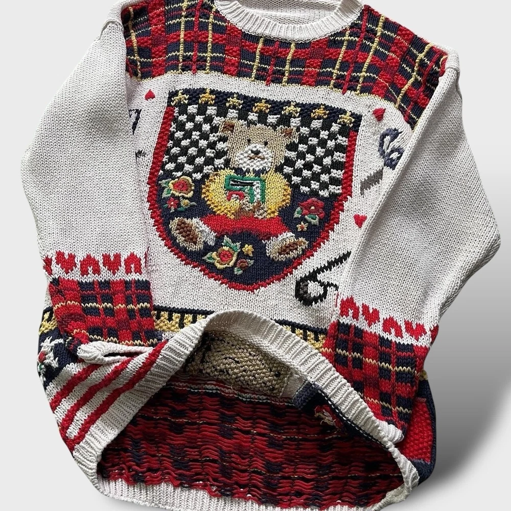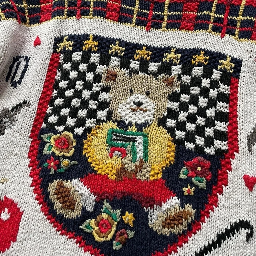 Vintage knitted jumper | unique designer | Sur La Cote 💡 good condition- normal wash wear, no faults, there is a name written on the back on inside labels 💡 from Los Angeles based women owned designer brand Sur La Cote 💡 55% ramie 45% cotton 💡 incredible knit work including a teddy bear, scissors, eyeglasses, an apple, ink and notes and more 📐 label 'Free Size' best fits M-L, depending on styling, p2p 20" l27"