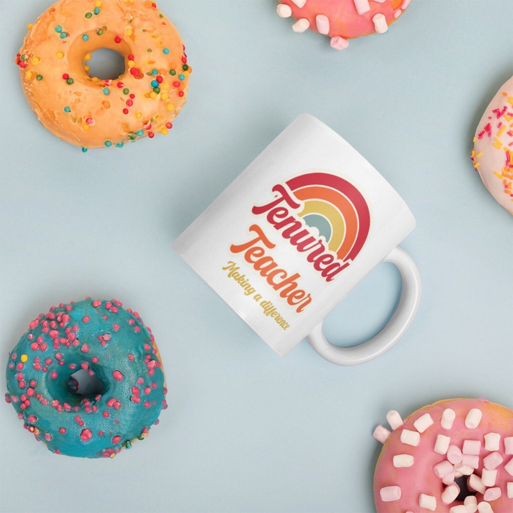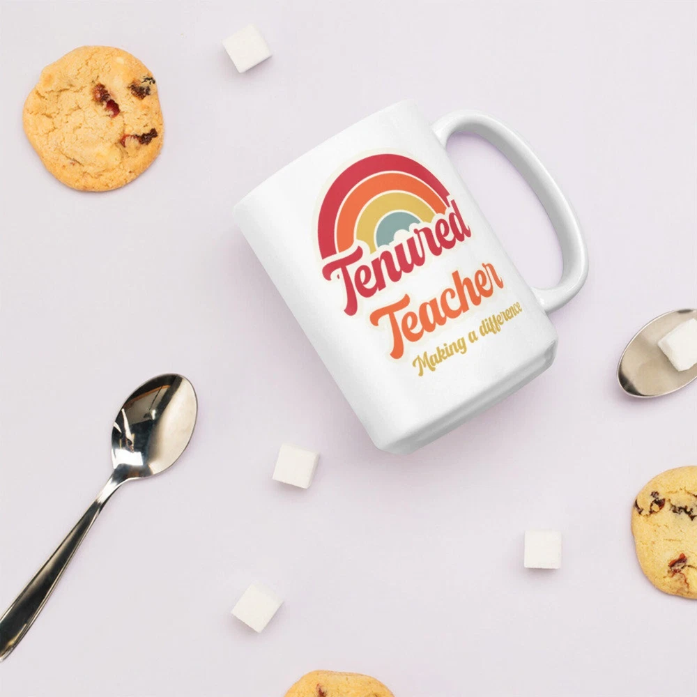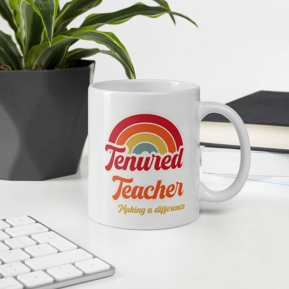 Tenure Mug For Teachers Retro Rainbow Tenured Teacher Making A Difference Congrats On Tenure Mentor Gift Promotion Product Details.. This high quality 11oz. ceramic white mug has a premium hard coat that provides crisp and vibrant color reproduction sure to last for years. Perfect for all hot & cold beverages. The highest quality printing possible is used. It will never fade no matter how many times you wash it. Material: 100% Ceramic. Print both sides. Dishwasher and Microwave Safe. High Gloss + Premium White Finish. Printed in the U.S.A. Personalized & Custom. We support personalized and custom mug to add custom, when placing an order, you can add notes to the "order note" in shipping address section. Also you can contact us directly via message. Shipping Info. Ready to ship in 1 to 2 business days, All products are made-to-order and proudly printed in the United States. Shipped by USPS and DHL, You will receive your order in 5-7 days. Replace & Refund. All products are defective during shipping broken, chipped will be replaced free of charge. You are not satisfied with the product, we will refund 100% money to you. If any other issues arise, please do not hesitate to message, we would be more than happy to assist you.