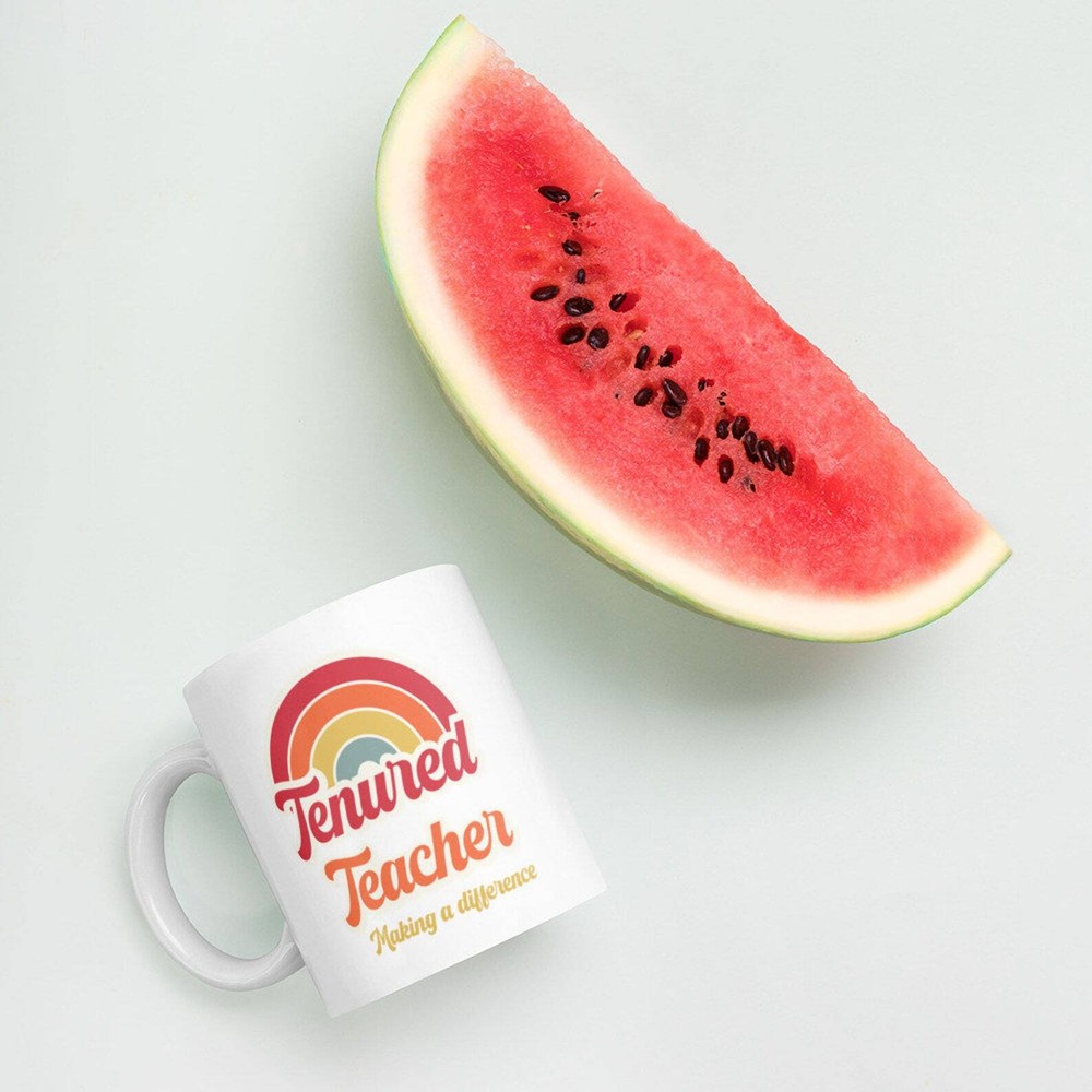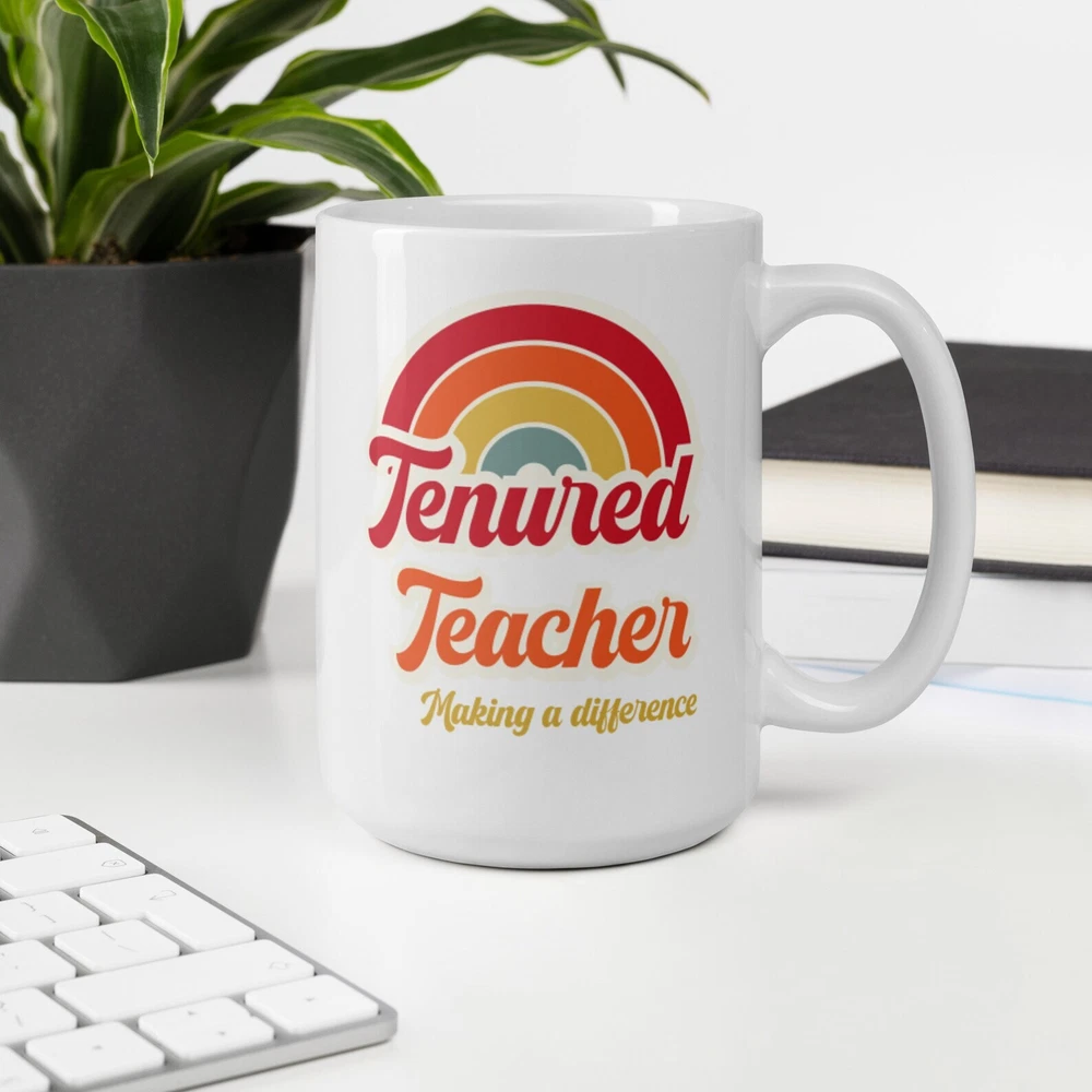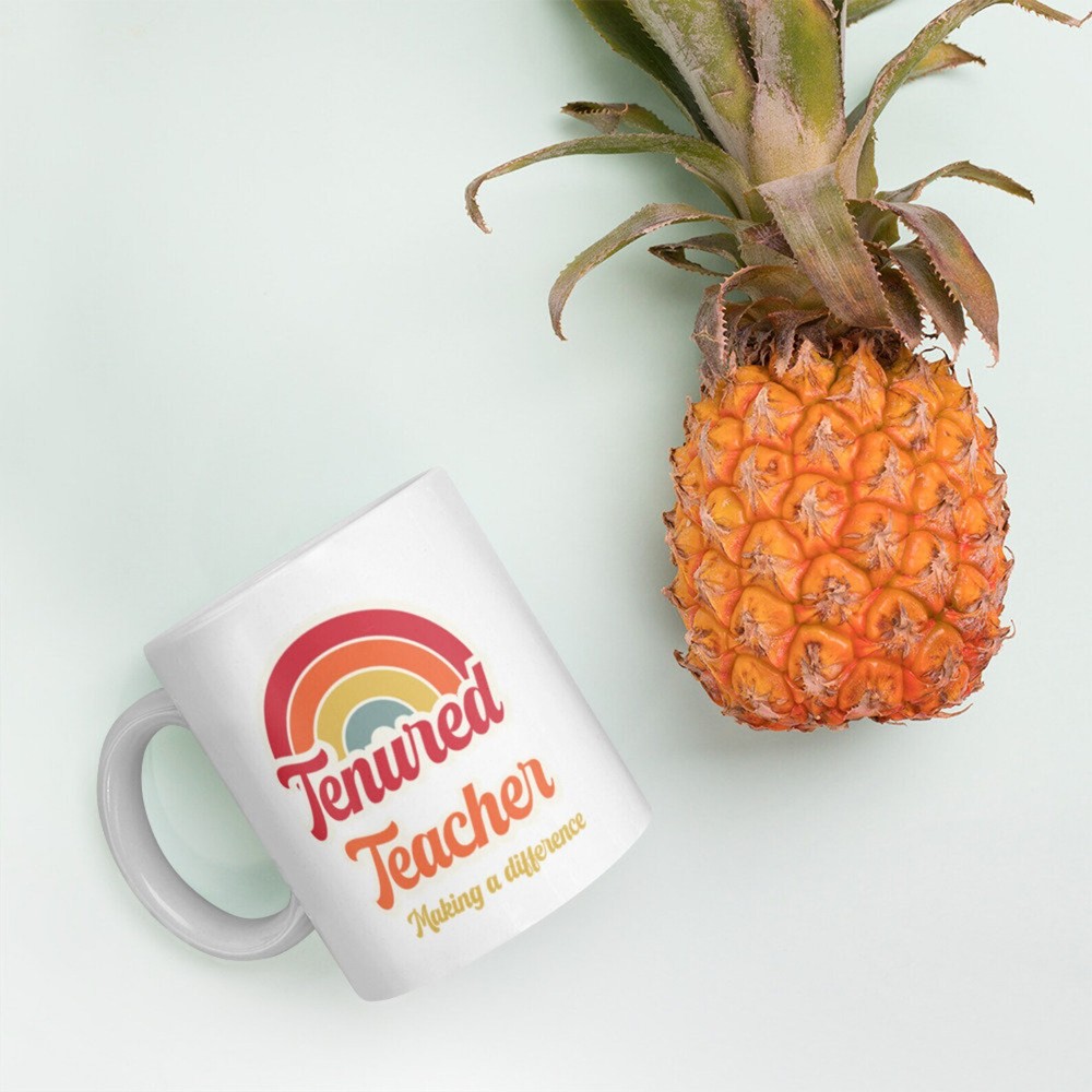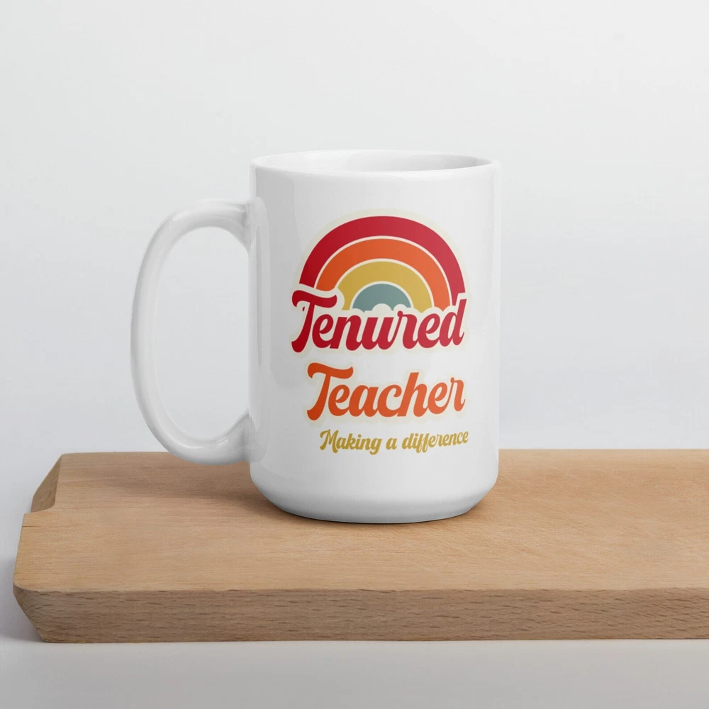 Tenure Mug For Teachers Retro Rainbow Tenured Teacher Making A Difference Congrats On Tenure Mentor Gift Promotion Product Details.. This high quality 11oz. ceramic white mug has a premium hard coat that provides crisp and vibrant color reproduction sure to last for years. Perfect for all hot & cold beverages. The highest quality printing possible is used. It will never fade no matter how many times you wash it. Material: 100% Ceramic. Print both sides. Dishwasher and Microwave Safe. High Gloss + Premium White Finish. Printed in the U.S.A. Personalized & Custom. We support personalized and custom mug to add custom, when placing an order, you can add notes to the "order note" in shipping address section. Also you can contact us directly via message. Shipping Info. Ready to ship in 1 to 2 business days, All products are made-to-order and proudly printed in the United States. Shipped by USPS and DHL, You will receive your order in 5-7 days. Replace & Refund. All products are defective during shipping broken, chipped will be replaced free of charge. You are not satisfied with the product, we will refund 100% money to you. If any other issues arise, please do not hesitate to message, we would be more than happy to assist you.