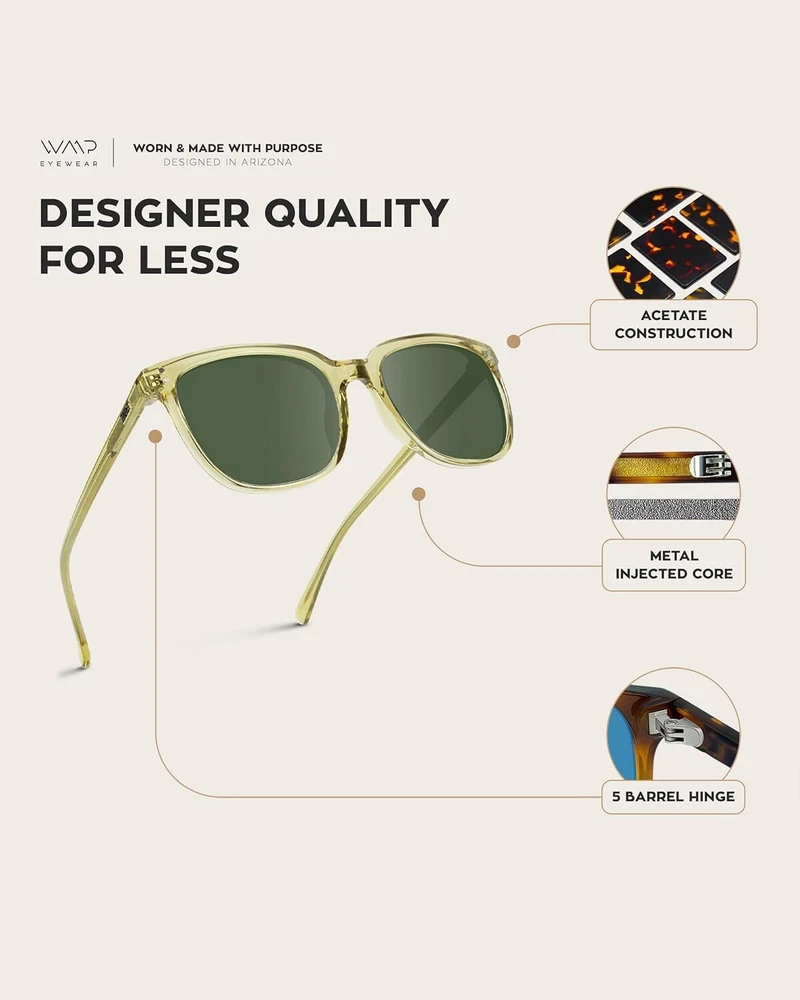 Product Description Polarized Classic Retro Flat Square Unisex Sunglasses PREMIUM QUALITY: Crafted with durable five barrel stainless steel hinges and optical-grade materials like Acetate and TR90, our stylish sunglasses are stronger and more flexible than typical plastic frames. With exquisite temples and solid metal hinges, they're both comfortable and long lasting. AFFORDABLE LUXURY: Inspired by the latest trends, WMP sunglasses deliver the quality of designer shades without breaking the bank. From classic frames to modern styles, every single pair is (W)orn and (M)ade with (P)urpose. TRUSTED PROTECTION: Whether you're hiking, driving or just enjoying a day at the beach, our luxury sunglasses help shield your eyes from harmful rays. Featuring polarized lenses, they provide 99.99% UVA and UVB protection. SATISFACTION GUARANTEE: Don't love your UV glasses? Reach out to our support team and we'll help make things right. As a small, family-owned business based in Arizona, we're able to give you personalized attention for total satisfaction. About Us We are a reputable seller with many years of experience selling on eBay. Our goal is to provide high-quality products and excellent customer service. Shipping Items will be shipped within 1-3 business days when we received payment. (Orders are not processed on weekends & holidays) Tracking information will be sent once item is shipped. Delivery time depends on destination and other factors Item is shipped to ebay address. Leaving correct address can minimize delay. For international shipping and shipping to Guam, Hawaii and Alaska, Please contact us before placing the order. International buyers please note: Import duties, taxes and charges are not included in the item price or shipping charges. These charges are buyer’s responsibility. We will try our best to reduce the risk of the custom duties. Local pick-up is unavailable at the moment. Contact Us We reply any email messages within 1 business / working days(off-duty at weekend). If you do not get a response from us, then please check your junk or spam mailbox. Our Business hours: Mon-Fri 9:00-18:00, UTC/GMT +8 hours. Please contact us either by clicking "contact seller" in the "purchase history" section or simply click "ask a question" at the bottom of this page. If you are unsatisfied with our item or service, please contact us before leaving any feedback. We are committed to resolve all issues in a friendly and satisfactory manner.