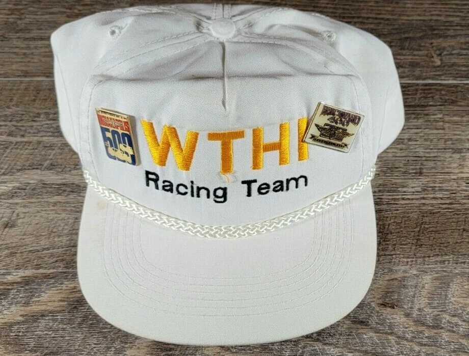 Retro WTHI Racing Team Hat With Indianapolis 500 and Brickyard 400 Pins. The hat is in used but good condition with some minor seam damage to the T. The hat comes with 2 pins one from the 78th Indianapolis 500 on May 29th 1994 and one from the Brickyard 500 inaugural race with no date. The hat belonged to a announcer. This would make for a great addition to ones retro racing collection. Please let me know if you have any question. Check out my other listings for unique, thrifty finds!