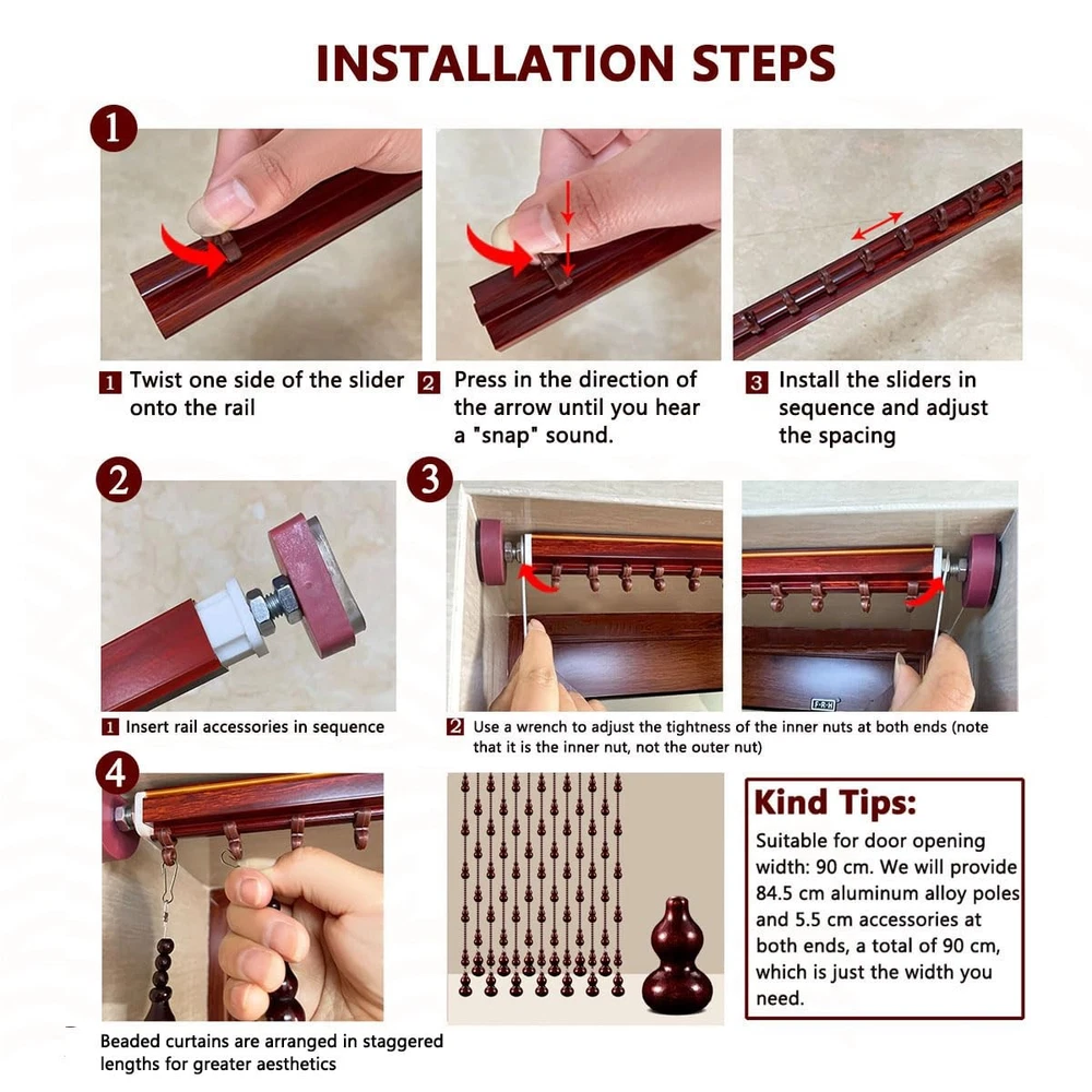 Natural Soild Wood: Beaded Curtains are made of peach wood. High-quality natural solid wood, the particle size is uniform, bright color, varnish wrapped, non-cracking, non-aging, non-fading, long service life. Bead Curtain Size: Each wood beaded curtain is 35.5" x 78" (90x198cm) with 29 string attached to a Aluminum alloy rail.The higher density of the rope is 3.6cm, Generally, the interval of 2-3cm bead curtains is more beautiful. Perfect Decoration: Used as door beads curtain, doorway curtain, closet curtain, room divider, wall decoration, window treatment,Can be used for the family’s restaurant, living room, bedroom, bathroom, kitchen. Privacy Protection: Bead curtain partition is a soft partition commonly used in modern times, which can maintain good air circulation, while protecting privacy and effectiveness Block sight, providing you with a comfortable indoor environment. Easy to Install:Very easy to install, The product contains all the hanging hardware needed for installation, We have detailed installation instructions that you can install in minutes.