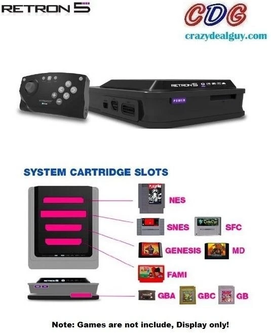 Retron 5 Game Consol for Nintendo NES/SNES/Famicom/Sega Genesis/Game Boy Games Retron 5 Game Consol for Nintendo NES/SNES/Famicom/Sega Genesis/Game Boy Games The latest 5th Generation Retro System is Finally Here, The Long wait is over. The RetroN 5 plays Gameboy, Gameboy Color, Gameboy Advance, Famicom, Super Famicom, Nintendo NES, Super Nintendo SNES, Sega Genesis, and Megadrive cartridges with enhanced resolution, improved interpolated sound, screenshot capture, and the ability to have on the fly save states. The ultimate HD remake: Hyperkin presents the RetroN 5, a revolutionary new way to experience classic games in high definition; the first of its kind with an all-digital HDMI output. The RetroN 5 plays Gameboy, Gameboy Color, Gameboy Advance, Famicom, Super Famicom, Nintendo, Super Nintendo, Sega Genesis, and Megadrive cartridges with enhanced resolution, improved interpolated sound, screenshot capture, and the ability to have on the fly save states. The RetroN 5 is the retro gaming console that brings you back to a world where recharging health is cheating, you can have as many guns as you want, and achievements aren't just some numbers on a screen. Package Included : 1x RetroN 5 console 1x Bluetooth Wireless Controller 1x HDMI Cable 1x AC Adapter with 4 variable head sockets 1x Wired SNES Controller Return and RMA Exchange Policy. Please refer to our Terms and Conditions page.