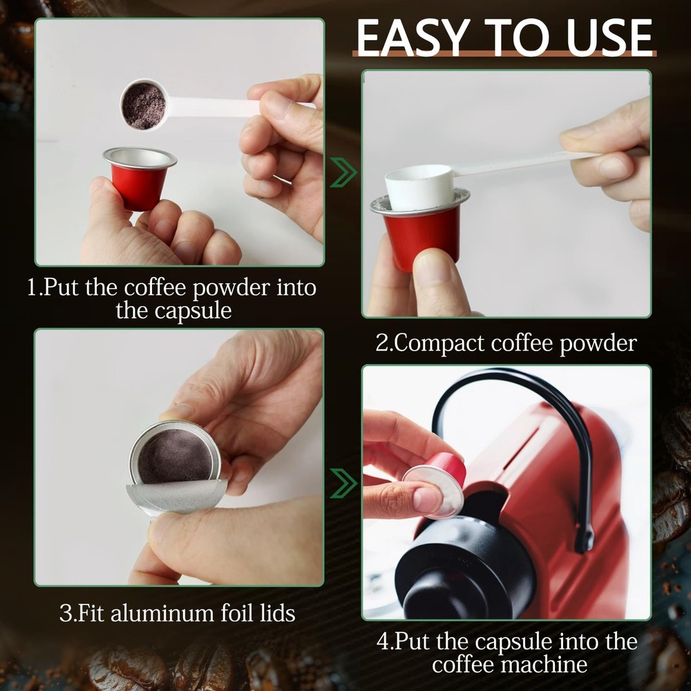Reusable Nespresso Capsules for OriginalLine Machines - Save Money, Reduce Waste Take control of your coffee experience and enjoy endless brew options with this set of refillable coffee capsules. Designed to provide cost savings and environmental benefits, these pods allow you to use your favorite ground coffee, giving you superior flavor and variety compared to pre-filled capsules. Eco-Friendly & High-Performance Features Full Compatibility: Engineered to work perfectly with Nespresso OriginalLine machines (including Pixie, Essenza Mini, Citiz, Lattissima, etc.). **Not compatible with Vertuo machines.** Use Your Own Coffee: Fill the reusable pods with any gourmet ground coffee you prefer, allowing you to tailor the strength, flavor, and roast to your exact liking. Cost-Effective Solution: Significantly reduce your per-cup cost by eliminating the constant need to buy expensive, single-use factory capsules. Food-Grade Material: The pods are made from safe, durable, food-grade plastic, ensuring no harmful substances leach into your coffee. The set includes disposable foil lids for easy sealing. Simple to Use, Great Results The process is quick and simple: just fill the pod with your grind, seal with a foil lid, and brew. Enjoy great crema and a rich, satisfying shot every time. Benefits of Switching: Choose from Local Roasters and Specialty Grinds Significantly Lower Per-Cup Coffee Costs Reduces Plastic and Aluminum Waste from Disposable Pods Easy Clean-Up and Quick Refill Process Start enjoying personalized, sustainable, and cost-effective espresso today with this simple replacement capsule system!