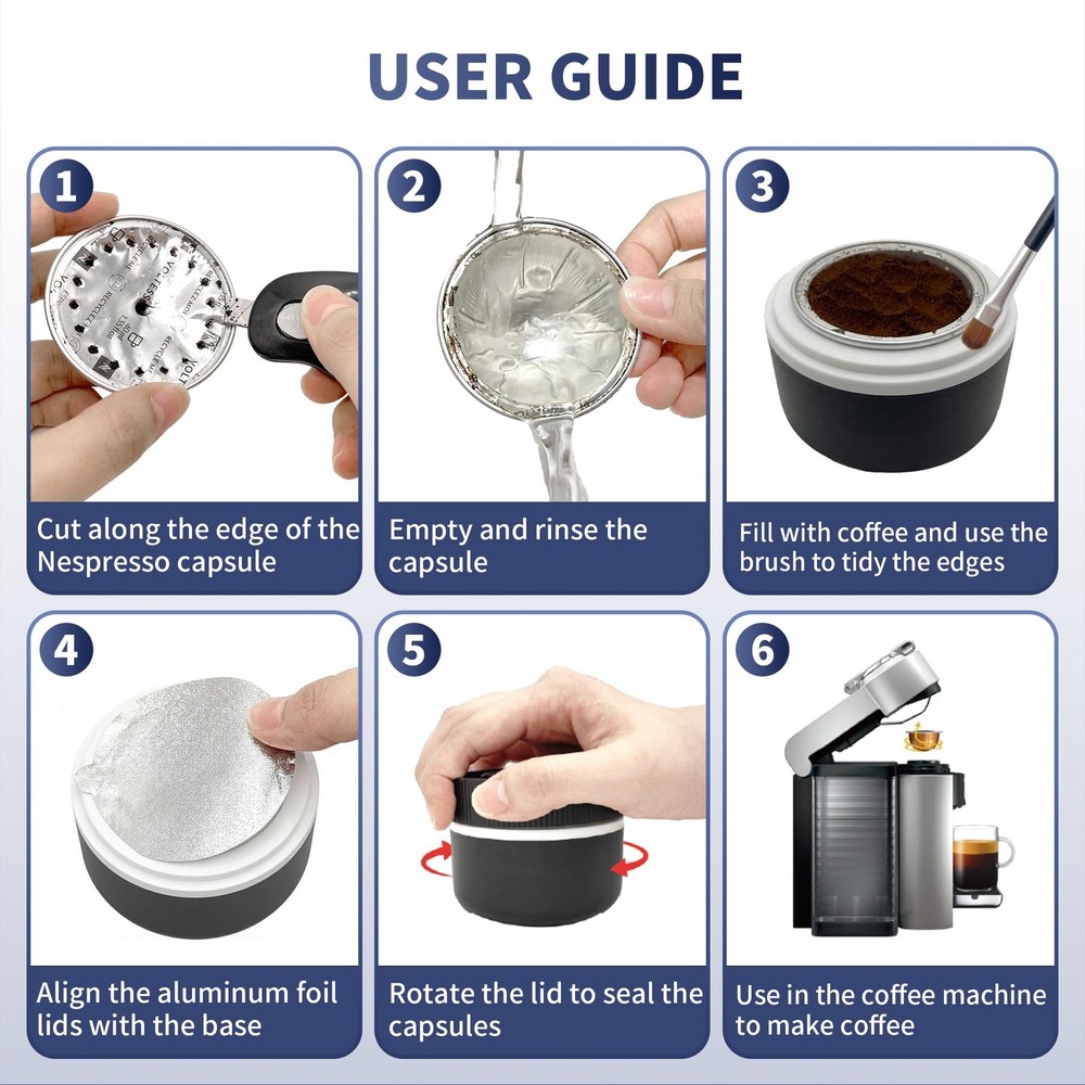 Reusable Pods Kit for Nespresso 1 Holder + 100 Lids + 1 Scoop, Black Description Features: Save money and Reduce Waste: With our Reusable Pods Kit, there's no longer any need for wasted foil tops or grounds scattered everywhere. It's a fantastic solution for saving money and cutting down on both paper and coffee waste Designed for Nespresso Vertuo Capsules: Our coffee pod covers foil lids kit is specifically designed for Nespresso Vertuo Capsules, accommodating cup sizes of 1.35oz, 2.7oz, 5.07oz, and 7.77oz. Please note that it is not compatible with Nespresso OriginalLine Capsules. Comprehensive Kit: Our reusable coffee capsule kit for nespresso comes complete with a capsule base, 100 aluminum foil seals, a cleaning brush, and a scoop (pods not included). With this kit, you can effortlessly craft high-quality, reusable coffee pods using your favorite coffee. Easy to Use: Refilling your coffee pods with our reusable pods kit is quick. simply place the emppodsty capsule into the base, add your preferred coffee, and use the foils to align along the edge of the capsule. then, press the top cover of the base to create a new capsule. Flawless Sealing for Your Nespresso Vertuo Pods: Our reusable pods for nespresso ensures a perfect seal every time, preventing any messy spills caused by unsealing capsules. Product Details: Handling We will ship all orders within 1 business day of payment. Delivery We Do Not Ship Outside of the Continental US. Return Policy All items qualify for returns within 30 days of receipt. Buyer is responsible for return shipping on any item that is not damaged. Feedback We take our reputation seriously, we buy and sell online, so we understand the value of trust. If you are unsatisfied with your order, please contact us and we will work with you to resolve it to your satisfaction.