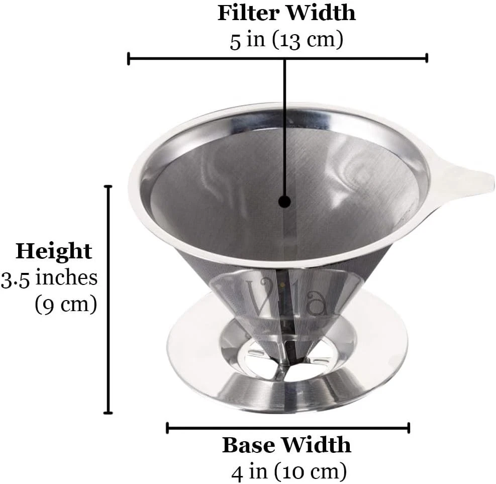 Reusable Stainless Steel Coffee Filter Fine Mesh Pour Over Dripper Paperless Taste Your Coffee, Not The Filter --- Coffee lovers agree that maintaining the flavor profile of a specific kind of coffee is essential to thoroughly enjoying a cup of coffee. Common paper coffee filters are white or brown paper filters that can affect the taste of your coffee. To ensure that you taste the delicious flavor of your special coffee, use the Vila Stainless Steel Coffee Filter. Save Money And The Environment --- Instead of paying for single-use paper filters over and over again, why not make a tiny investment into a reusable stainless steel coffee filter? Not only will the Stainless Steel Coffee Dripper from Vila save you money, but it will benefit the environment as well. Using treated paper filters can seep into the ground when dumped in landfills. Excellent For Pour Over Tea Brewing --- Not everyone is a coffee aficionado, but the Vila Stainless Steel Filter is useful for a wide variety of herbs and teas as well. Loose herbs, tea leaves and tea bags of all sorts can be brewed using the handy filter. Simply place your oolong, green tea, Earl Grey, chamomile or Darjeeling tea into the mesh filter, pour on hot water and allow to steep. Compact, Fits Standard Sized Coffee Cups --- The compact and lightweight Vila Coffee Dripper stands 3.5” (9 cm) tall and has a 3.9” (10cm) bottom base. It sits perfectly atop almost any coffee cup or mug without wobbling while your coffee drips smoothly in. Portable and practical, the coffee dripper is an excellent tool in your home kitchen, office lounge and camp site. Made Using Durable, Reliable Materials --- Made using high quality 18/8 grade stainless steel, the Coffee Dripper from Vila is extra durable, and is able to handle high temperatures. Reinforced fine steel mesh is used so that no grounds end up in your coffee. Stainless steel is a superior choice to paper, plastic, ceramic and glass coffee filters. Product description Maintains Integrity of Coffee Flavor Profile From bright and lively Arabica coffee blends to deep and earthy Sumatra coffee, there are so many different types of coffee flavor profiles to try. Forget about paper coffee filters that can dilute the flavor of yummy coffee grinds and embrace the benefits of a reusable stainless steel coffee dripper. You will finally be able to fully enjoy the essences and oils of each new coffee blend that you taste. The Vila Stainless Steel Coffee Dripper is necessary for any coffee connoisseur that truly appreciates the rich, bold and unique flavors that come from a handcrafted cup of coffee. How to Use the Pour Over Coffee Dripper The simple to use Vila Stainless Steel Coffee Dripper gives you the power to brew amazing coffee like a professional barista. Preheat the coffee filter by pouring hot water over it and then place the base on top of the cup, pot or mug that you intend to fill with delicious coffee. Add two tablespoons of coffee grounds per six ounces of water Slowly begin pouring the hot water into the cone shaped filter in a circular motion, keeping the water level consistent. Allow the coffee grinds to brew and flow through the tight fine mesh bottom and into your cup. When finished, dump the grinds, wash the filter and enjoy your delectable cup of joe. Cleaning Instructions: Once you are done using the coffee brewer, simply rinse it under running water or put it in your dishwasher immediately after use to restrict coffee grinds and oils from clogging. For prolonging its shelf-life, soak the filter in a solution of half white vinegar and half water for 30 minutes or leave the pour over coffee filter in the oven for 4 ~ 5 minutes once a month. The high-temperature roasting can help remove the fine coffee residues in the filter. 5.04 inches x 5.08 inches x 3.98 inches. Weight: 5.0 oz Unit Count 1.0 Count Material Stainless Steel Global Trade Identification Number 00735899170779 Item Weight 5 ounces Shape Cone Manufacturer Creative Store Package Dimensions 5.08 x 5.04 x 3.98 inches Number of Pieces 1