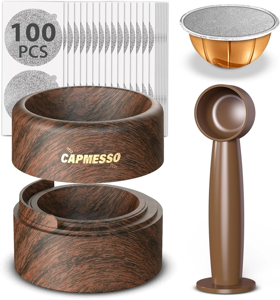 ☕Ultimate Refill Kit for Reusable Nespresso Vertuo Pods: Experience unparalleled convenience with our all-in-one Nespresso pods vertuo refill kit, including 100 sturdy aluminum foil seals, a dual-ended brush for easy filling, and a seamless filling base. This innovative vertuo pod kit enhances refill efficiency by over 50%, saving you time, money, and reducing waste. Also, the plastic base paired with walnut wood grain adds elegance to your coffee bar (Pods not included) ☕Perfect Fit for All Vertuo Pods: Designed for compatibility with all size Nespresso Vertuo refillable pods (excluding bottom vertuo capsules) on all VertuoLine machine,including Vertuo,VertuoPlus, Vertuo Next and Vertuo Pop. Our nespresso accessories kit allows you to create reusable vertuo pods for nespresso in just 15 seconds, simplifying your coffee-making routine ☕The Newest Foil Lids for Maximum Freshness: Our upgraded aluminum lids covers are expertly embossed for strength, preventing tearing and leakage as others while ensuring an airtight seal. No mess and no harm to your expensive machine. Enjoy fresh, full-bodied espresso with a rich crema every time ☕Smart & Effortless Brewing Solution: Refilling your Nespresso refillable pods has never been easier. Just fill, seal, and press! Our vertuo refill kit prevents mess and ensures precise alignment of foil seals, without obstructing barcode recognition for optimal flavor extraction ☕Game-Changer for Coffee Lovers: Say goodbye to expensive single-use coffee capsules and hello to endless coffee possibilities! Reusing your nespreso vertuo pods not only saves you money but also helps the planet. With our vertuo pod refill kit, enjoy custom coffee flavors and make every cup special Product description