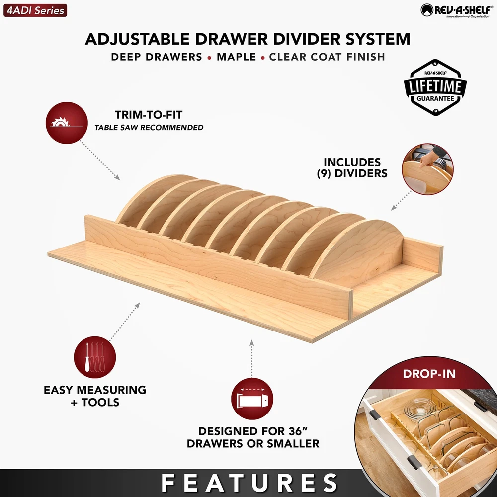 Powered by Frooition Top Products Kitchen Bathroom Lighting Fans Hardware Decor & Organization Rev-A-Shelf 4ADI-36-1 Adjustable 31"W Deep Drawer Organizer for Trays, Lids, Cutting Boards for 36" Base Drawer Overview Item Description Deep drawers are a great addition to any kitchen, but organizing them can be a challenge. The 4ADI Series Adjustable Deep Drawer Insert is the perfect way to restore some order. This insert is great for storing cookware and lids, bakeware, cutting boards, casserole dishes, and more. Features: Wood drop in drawer insert with 9 adjustable dividers Shipped ready to install Removable dividers for easy customization Overall height is 6" Trimmable Designed for 36" deep base cabinet drawers Perfect for cookware, lids, tupperware, bakeware, cutting boards, and more Limited Lifetime Warranty Specifications: Includes (1) wood drawer insert Includes (9) adjustable and removable dividers Height: 5.98" Width: 31.22" Depth: 19.49" Minimum opening: 36"W x 122"D x 6.25" Why Choose BuildInc? OUR PROMISE TO YOU About Us At Build, we promise to provide the best selection we can, most competitive pricing, and unmatched customer service. Our store has quality home improvement products from trusted manufacturers like Moen, American Standard, Delta, Kraus, Kichler, Progress Lighting, Schlage, Kwikset, Baldwin, Broan, NuTone, Air King, and Rev-A-Shelf. With over 200,000 home improvement products for you to choose from, we have just what you need to get your project done. Fast & Free Shipping We promise to make it our priority to get you your items as fast as we can. We ship from 440 warehouses around the country, ensuring that your product will get to you as soon as possible. We know you're eager to get your hands on your new purchase, we would be too. As a bonus, most items ship for free. Returns We are happy to accept returns of unused or defective items for a refund within 30 days from the date of delivery. For returns outside 30 days, please contact our Customer Service team to go over our options. For full details, please view the Shipping and Payments tab above. To initiate a return simply go to the eBay Returns Portal and submit a return request. We ask that all items be returned with all original components via a traceable method. Once your return is received and processed, we will quickly get your refund or replacement issued. If for any reason you are unsatisfied with your purchase or for product or warranty questions, please contact Customer Service team for assistance. More Items! View more great items Ackland AKM-S-1X3HBP-CA-SAMPLE Sample Only of AKM-S-1X3HBP-CA - Auralie $11.35 Ackland AKM-P-13X11RDM-CA-SAMPLE Sample Only of AKM-P-13X11RDM-CA - Calico $11.35 Ackland AKLTCMAR16X24HUB-EA Marzana 16 in. x 24 in. x 2 in. Honed - Aurelia $101.40 Ackland AKPLPM6X24F-SM Sample Only of AKPLPM6X24F-SM - Auric White $20.42 About Us | Shipping | Returns | Contact Us | FAQ | Collections | Special Offers! Powered by Frooition Frooition Frooition | No-js Template | eBay design, eBay store design, eBay shop design, eBay template design, eBay listing design (ver:froo_no_js) This listing is currently undergoing maintenance, we apologize for any inconvenience caused.