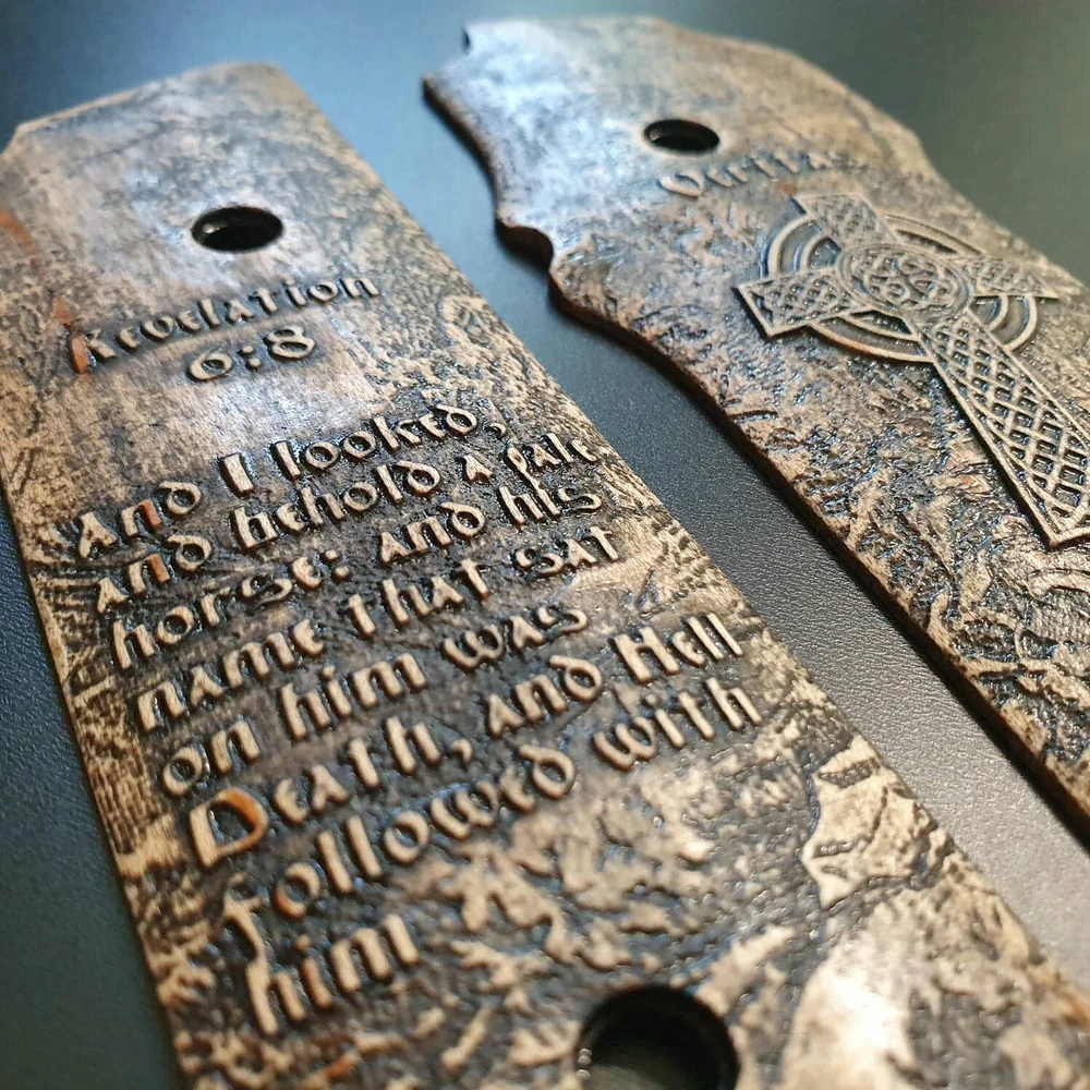 New Smith And Wesson 645 grips with "Revelation 6:8" design. Carved from solid natural wood Note: The original pistol frame has square shaped seating screws. You will have to make small modifications to the round holes in the grips yourself to ensure a successful fit. Since these screws are installed at different angles on each model, this operation falls to you. It's not complicated. You need to trim the inner walls of the grips screw holes just a little bit so that they match the faces of the screws on the frame - Cut by CNC. Sanded, painted and oiled by hand