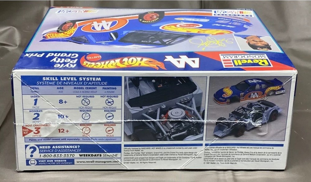 For NASCAR enthusiasts and model car collectors alike, the Revell Kyle Petty #44 Hot Wheels Pontiac Grand Prix Model Kit is a must-have addition to your collection. This 1:24 scale plastic model car features a multi-color design and comes in an unopened box for preservation of its pristine condition. The model car is based on Kyle Petty's NASCAR racecar from the 1997 race series, adding a touch of nostalgia to your collection. The Revell model car is perfect for ages 10 and up, making it an ideal gift for children and adults alike. The kit includes all necessary materials to assemble the model car, with easy-to-follow instructions for step-by-step assembly. This NASCAR racecar replica is a great way to show your support for Kyle Petty and the Hot Wheels series. Please see pictures for condition. Visit our Store for more NASCAR items. Thank you.