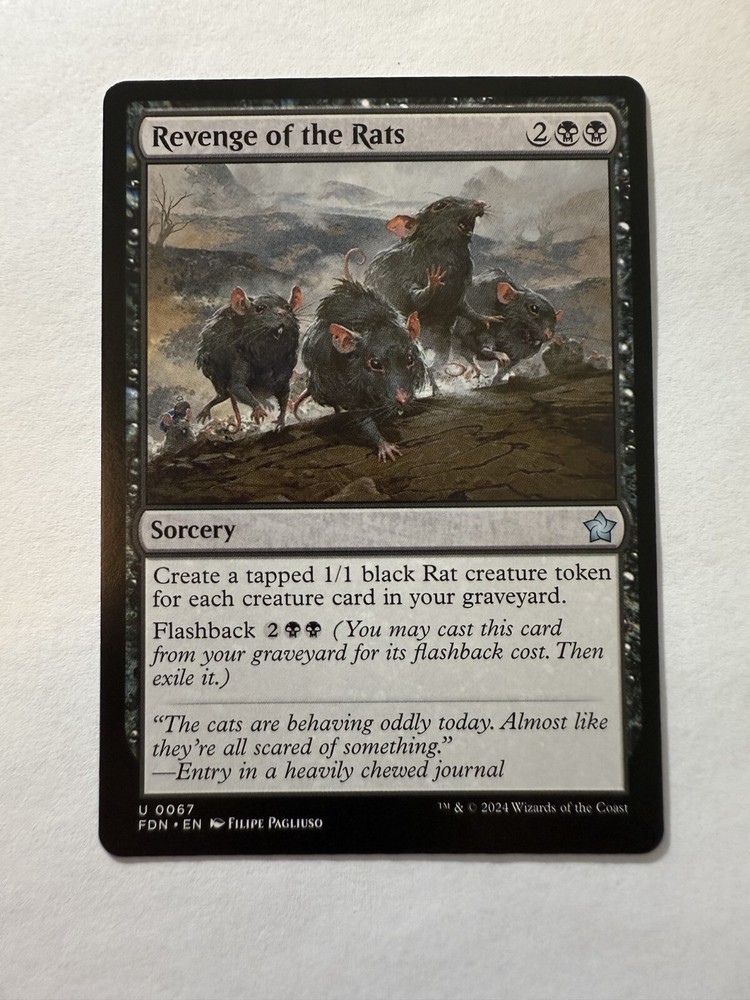 Finish:RegularAttribute/MTG:Color:BlackIllustrator:Filipe PagliusoGame:Magic: The GatheringLanguage:EnglishSet:FoundationsAdditional Description:Revenge of the RatsCard Number:67Card Name:Revenge of the RatsRarity:UncommonCard Type:SorceryManufacturer:Wizards of the Coastbrand:Wizards of the CoastCost:2bbCard Text:Create a tapped 1/1 black Rat creature token for each creature card in your graveyard.