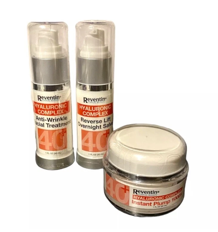 The following items are being offered as the complete anti-aging regimen for people over 40 and will not be sold separately: • 1 (one) Reventin 40+ Hyaluronic Complex Anti-Wrinkle Facial Treatment, 1 Fl. Oz. • 1 (one) Reventin 40+ Hyaluronic Complex Reverse Lift Overnight Salve, 1 Fl. Oz. • 1 (one) Reventin 40+ Hyaluronic Complex Instant Plump 1000X, 1 Fl. Oz. Conditions are “New” sealed without boxes. The quality of these unboxed items will be as genuine as the original packing. Items are 100% authentic, American made & original formulations. No expiration dates. Sold as is, as found and as pictured. Any concerns about condition please address these concerns before purchasing. We aim to provide accurate and honest descriptions. Please read descriptions carefully. We try to describe everything in as much detail as possible, but if you still have questions, please don't hesitate to ask. We will be more than happy to answer your questions and provide you with additional pictures if necessary. We guarantee 100% satisfaction. We will gladly accept returns under the following conditions: * Contact us directly by selecting the ‘CONTACT SELLER’ option. If you open a return request or leave negative feedback before giving us a chance to resolve the problem, we assume our transaction and correspondence as closed. Please follow through with your return request with eBay. We abide by eBay’s rules and regulations for returns and if they are met, you will refunded. If there is an issue with your purchase, PLEASE do not leave negative feedback before you have contacted us to resolve any issues. Please message us if you have any questions or concerns and we will work with you quickly to resolve any questions or problems. To ensure a positive shopping experience for all our customers, if we identify unreasonable, problematic transactions, we may restrict or refuse future transactions from such customers. Buy with confidence and rest assured that you are dealing with an experienced store whose #1 priority is customer satisfaction. We list new items continuously, so add us to your favorites and check back often as you never know what you'll find here. Look around in our store as we have a huge selection of fragrances, skincare, makeup and other beauty products. Thank you for shopping with us! We want you to be happy with your purchase! PLEASE don't forget to leave positive feedback and give 5 stars in Seller's Rating. The information provided here is strictly to be used for informational purposes only. We do not represent or warrant the product details, ingredients and nutritional value, and any other product information to be accurate or complete. Manufacturers improve or change their product formulas, update labels, and change their packaging. It is recommended that you do not solely rely on the information described in this listing. For any specific product info or concerns it is recommended that you contact the manufacturer directly. If there are healthcare concerns or questions, please contact your licensed healthcare professional for advice. Attention VeRO members: We are not affiliated or endorsed by the companies mentioned in this listing. All trademarks and copyrights are acknowledged, they are only used for informative description of the items offered for sale. All items are authentic as evidenced in photos, legally acquired and owned, and hence covered under First Sale Doctrine. Unlawful VeRO removal of this listing WILL constitute perjury and result in legal action.