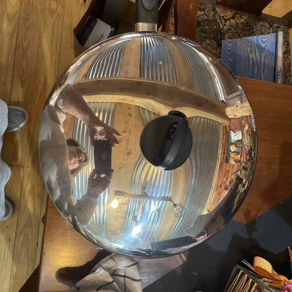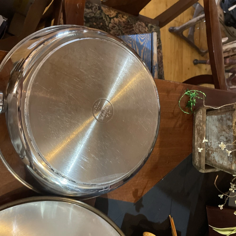 This vintage Revere Ware 12-inch deep fryer skillet with a vented lid is a versatile addition to any kitchen. Made of stainless steel with a tri-ply disc bottom, it is compatible with both electric and gas stoves. The round skillet has a silver color and a height of 2 1/2 inches. Collectors of vintage kitchenware will appreciate that this skillet is made by Revere Ware and features the brand's signature craftsmanship. It is perfect for frying up your favorite foods or for use as a serving platter. Add this unique piece to your collection today!