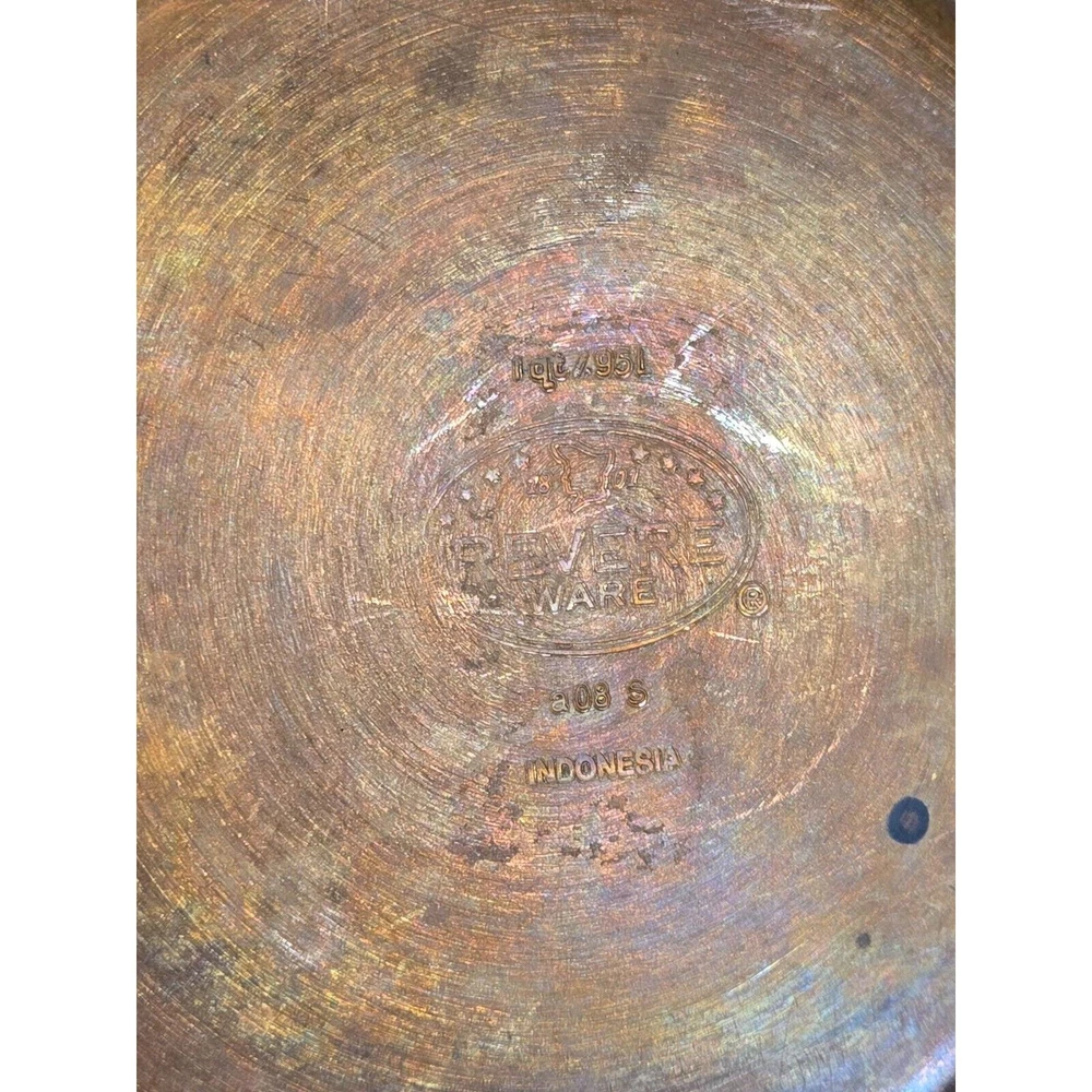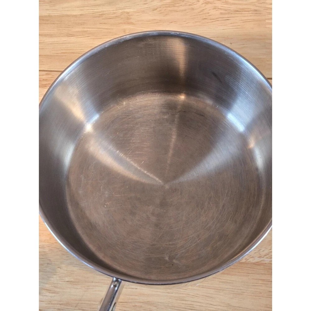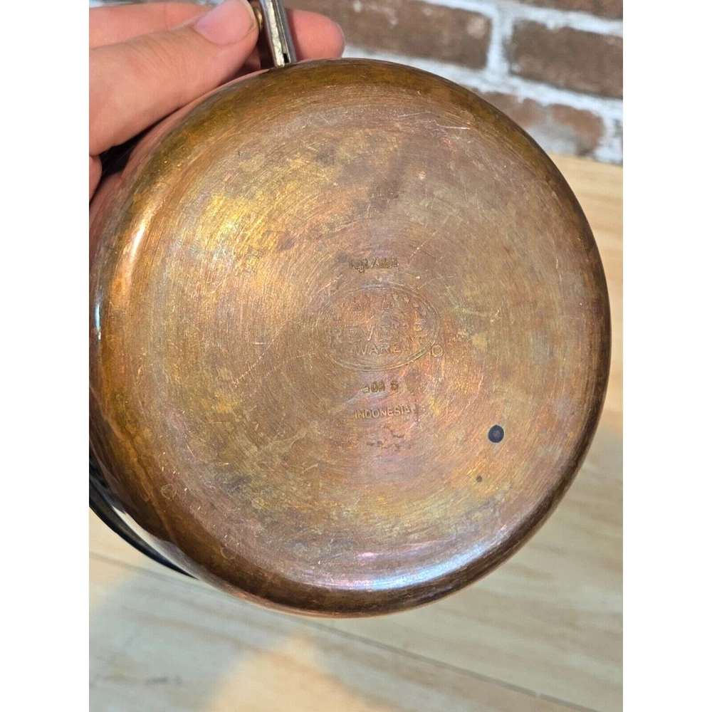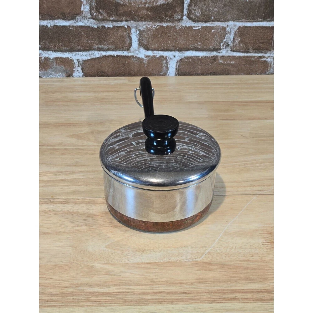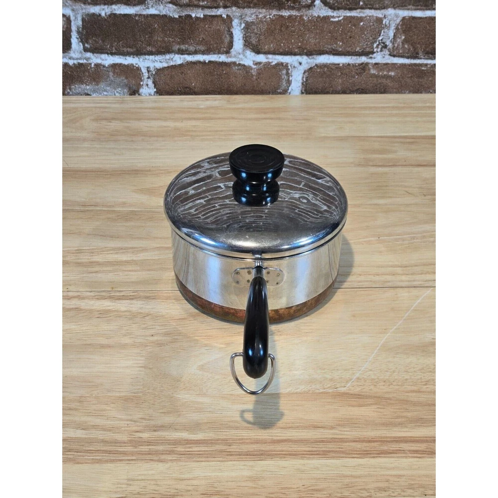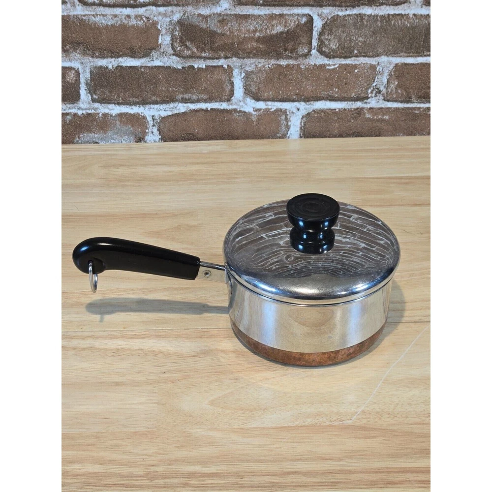 Add a touch of vintage to your kitchen with this Revere Ware Copper Clad 1 QT Quart Sauce Pan. The round-shaped saucepan is made of steel copper and has a silver copper color coating. It is compatible with both electric and gas stoves and comes with one pot and one lid. The saucepan has a capacity of 1 QT and features a stainless steel surface coating. It is an original piece and has not been licensed reproduced. The saucepan is perfect for cooking sauces and soups, and its unique design will make a great addition to your collection of cookware.