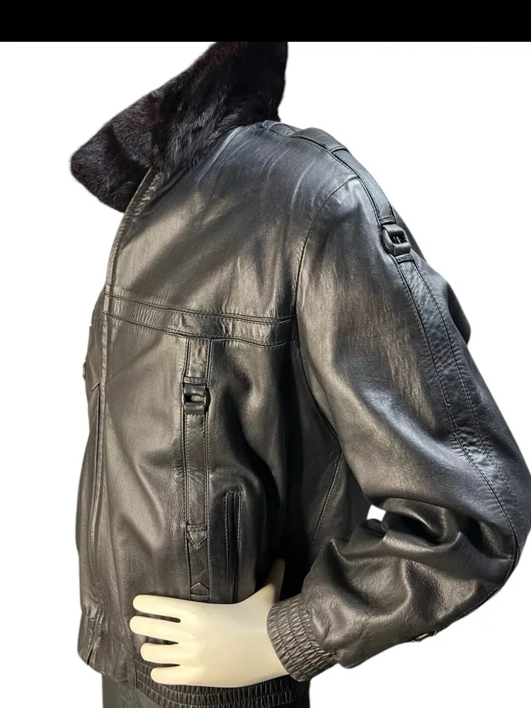 This custom made black reversible men's mink leather bomber jacket in size large is a stylish and luxurious outerwear option. Made in the United States, the jacket features a mid-length design with a classic fit and a zip closure. Perfect for various occasions such as parties, formal events, and business meetings, this jacket is both versatile and sophisticated. The unique reversible feature adds an extra touch of practicality, making it a versatile addition to any wardrobe for the winter season.