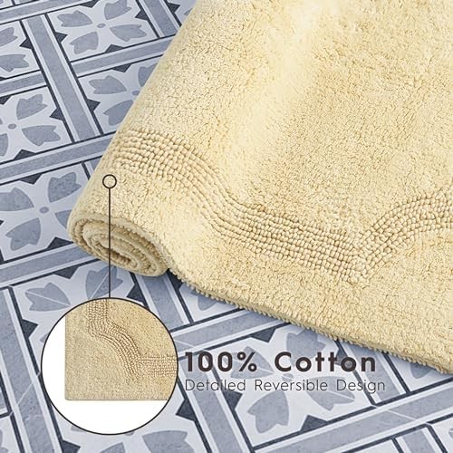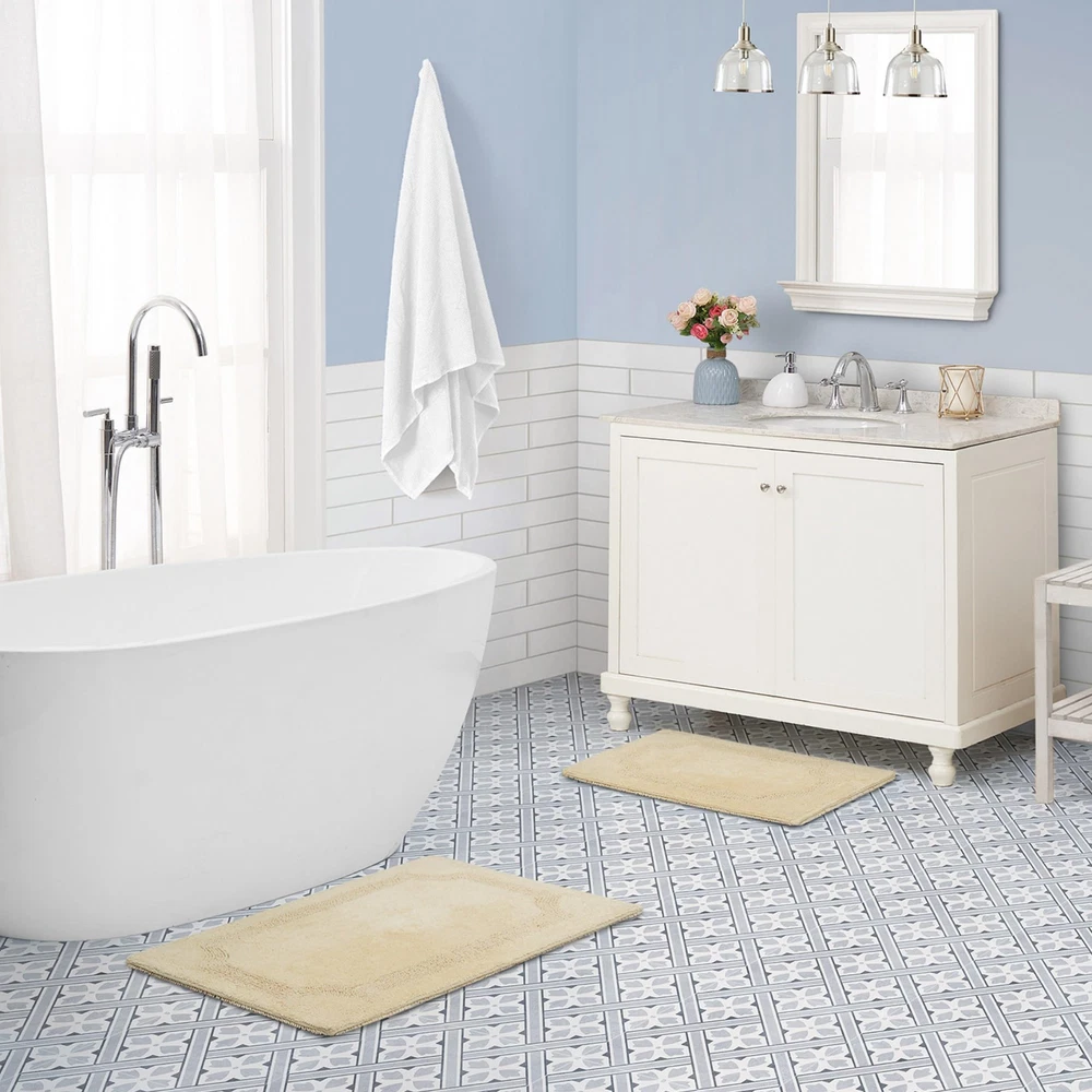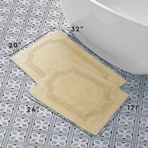2-piece set includes (1) 17" x 24" and (1) 20" x 32" bath rugs Super plush and absorbent 100% cotton Reversible for extended use and beauty Non-skid rug grippers recommended for uncarpeted floors including wood, tile or ceramic flooring (sold separately) Can also be placed on top of wall-to-wall carpeting or bare floors in a play room, child's bedroom, or den to inject a pop of color and accentuate existing décor