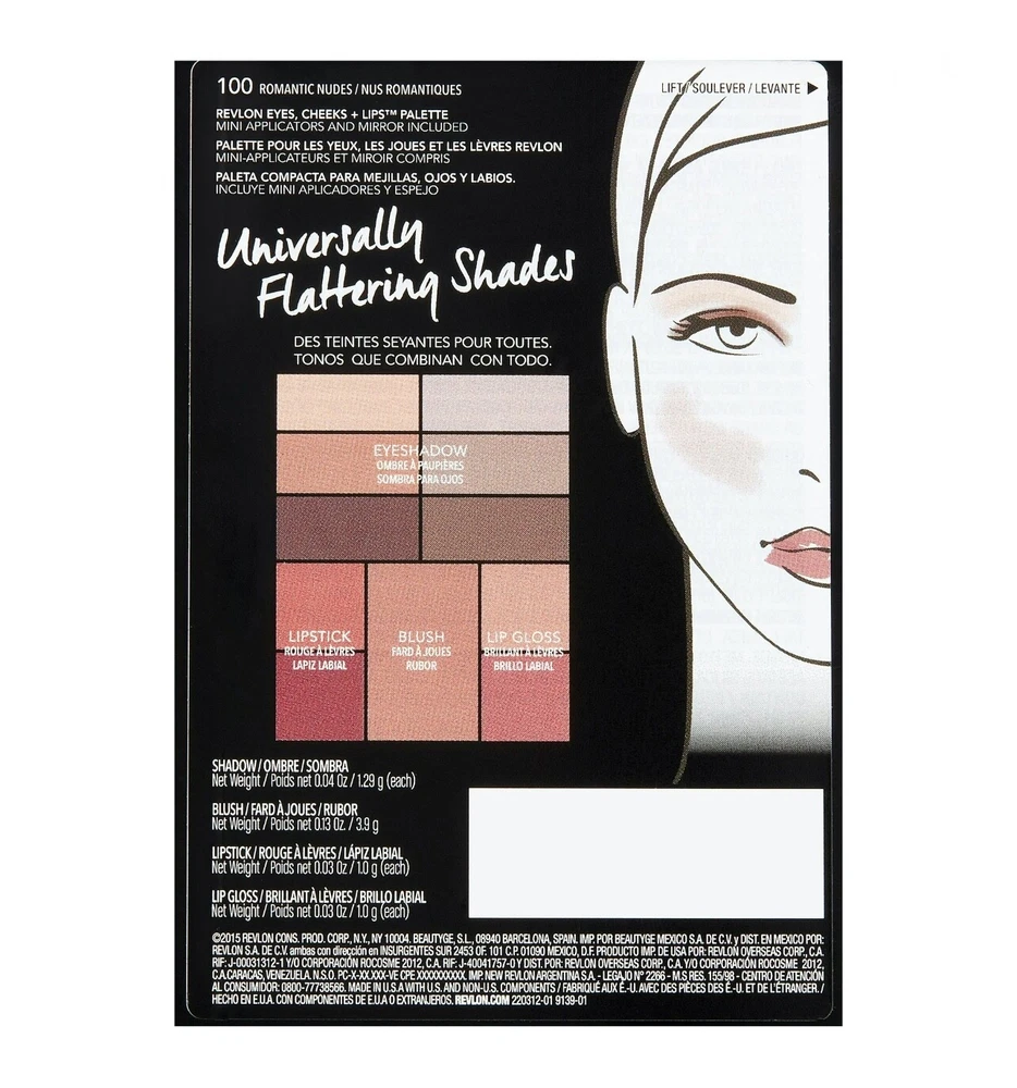 Volume: 1 fl oz Color: Multicolor Formulation: Balm, Cream, Pressed Powder gtin13: 309979139019 Expiration Date: N/A UPC: 309979139019 Model: 100 romantic nudes MPN: does not apply Brand: Revlon Period After Opening (PAO): 12M Number of Items in Set: 11 Alphabet Cream Type: none Sun Protection Factor (SPF): SPF 0 Material: Plastic Active Ingredients: Dimethicone, Mica, Talc Size: Standard Scent: Unscented Flavor: Unflavored Effect: Gloss, Matte, Satin Makeup Shade: Assorted, Nude Set Includes: Blush, Eye Shadow, Lipstick Product Line: Revlon eye, cheeks + lips Lash Length: None Coverage: Full Features: Animal Cruelty-Free, Hypoallergenic, Long Lasting Country/Region of Manufacture: United States Skin Type: All Department: Women
