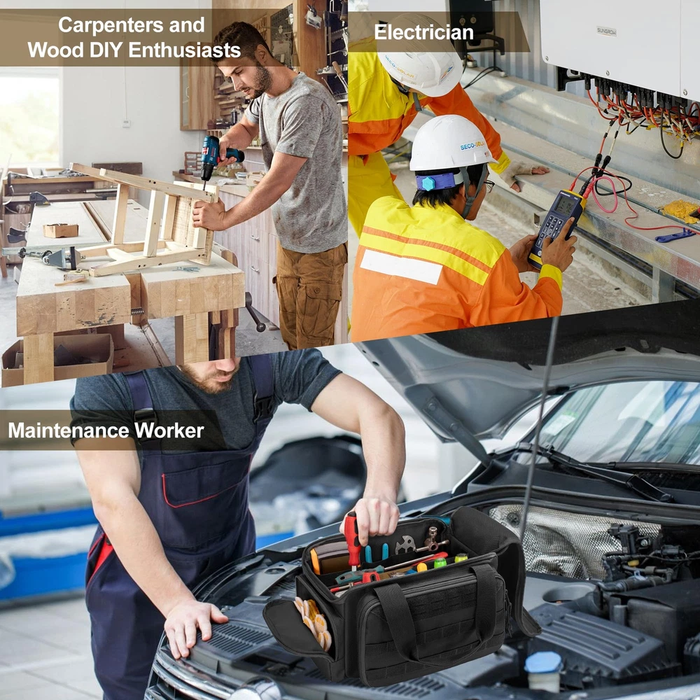 Rexmica 12-Inch Tool Bag with Anti-friction Bottom, Hand Tool Storage Organizer Bag for Men, Tactical Bag, Range Bag, Multi-purpose Work Bag for Repairman, Electrician, Carpenters, Handyman, Black DIMENSIONS - L 12.2” x W 6.7 x H 7.5”. This tool storage made of outstanding quality nylon material, the bottom with PU coated anti-slip fabric, which can reduce friction between the tool tote and the ground ensure long-term service. (Patented Design) WELL ORGANIZED - Main compartment with 1 removable divider and multiple slots for organizing various hand tools or small power tools, such as wrenches, pliers, screwdrivers, digital multimeter, small electric screwdrives. ACCESSORY POCKETS - Left side zipper pocket and right side mesh pocket suitable for adhesive tape, tape measure, gloves, etc. The front accessory pocket for some short tools. HAND TOOL BAG - The top handle with padded wrap for comfortable grip and relieve stress on hands.The full-opening design allows you to access the tools you want with one hand while working. Suitable as a daily tool bag at home, in the tool room or in the car trunk. MULTIPURPOSE - Rexmica tool organizer bag can meet your most daily demand, keeps hand tools and accessories organized. Multi-function work bag can also be used as an electrician tool bag or garden tool bag. A must-have tool bag for repairman, electrician, carpenters, handyman DIMENSIONS - L 12.2” x W 6.7 x H 7.5”. This tool storage made of outstanding quality nylon material, the bottom with PU coated anti-slip fabric, which can reduce friction between the tool tote and the ground ensure long-term service. (Patented Design) WELL ORGANIZED - Main compartment with 1 removable divider and multiple slots for organizing various hand tools or small power tools, such as wrenches, pliers, screwdrivers, digital multimeter, small electric screwdrives. ACCESSORY POCKETS - Left side zipper pocket and right side mesh pocket suitable for adhesive tape, tape measure, gloves, etc. The front accessory pocket for some short tools. HAND TOOL BAG - The top handle with padded wrap for comfortable grip and relieve stress on hands.The full-opening design allows you to access the tools you want with one hand while working. Suitable as a daily tool bag at home, in the tool room or in the car trunk. MULTIPURPOSE - Rexmica tool organizer bag can meet your most daily demand, keeps hand tools and accessories organized. Multi-function work bag can also be used as an electrician tool bag or garden tool bag. A must-have tool bag for repairman, electrician, carpenters, handyman Shipping from the USA All of our products are shipped from the USA, ensuring quick delivery to your destination. Payment We offer the following payment methods: PayPal, credit card, bank transfer, and eBay's secure payment system. Free Shipping & Free Returns Shipping within the USA is FREE. Additionally, any return is absolutely free for you. Risk-Free Purchase You have the option to return an item within 30 days without any justification. We cover the return shipping costs! Fast Shipping We ship immediately upon receipt of payment. Generally, the package is delivered within 2-3 days in the USA. If it takes longer, we will contact you. Quality and Costs Made in Europe, USA, China No customs fees or additional charges Total satisfaction guarantee Invoice with declared VAT available upon request in .pdf format Feedback Your feedback is very important to us. After you pay for your purchase, you will automatically receive positive feedback from us.