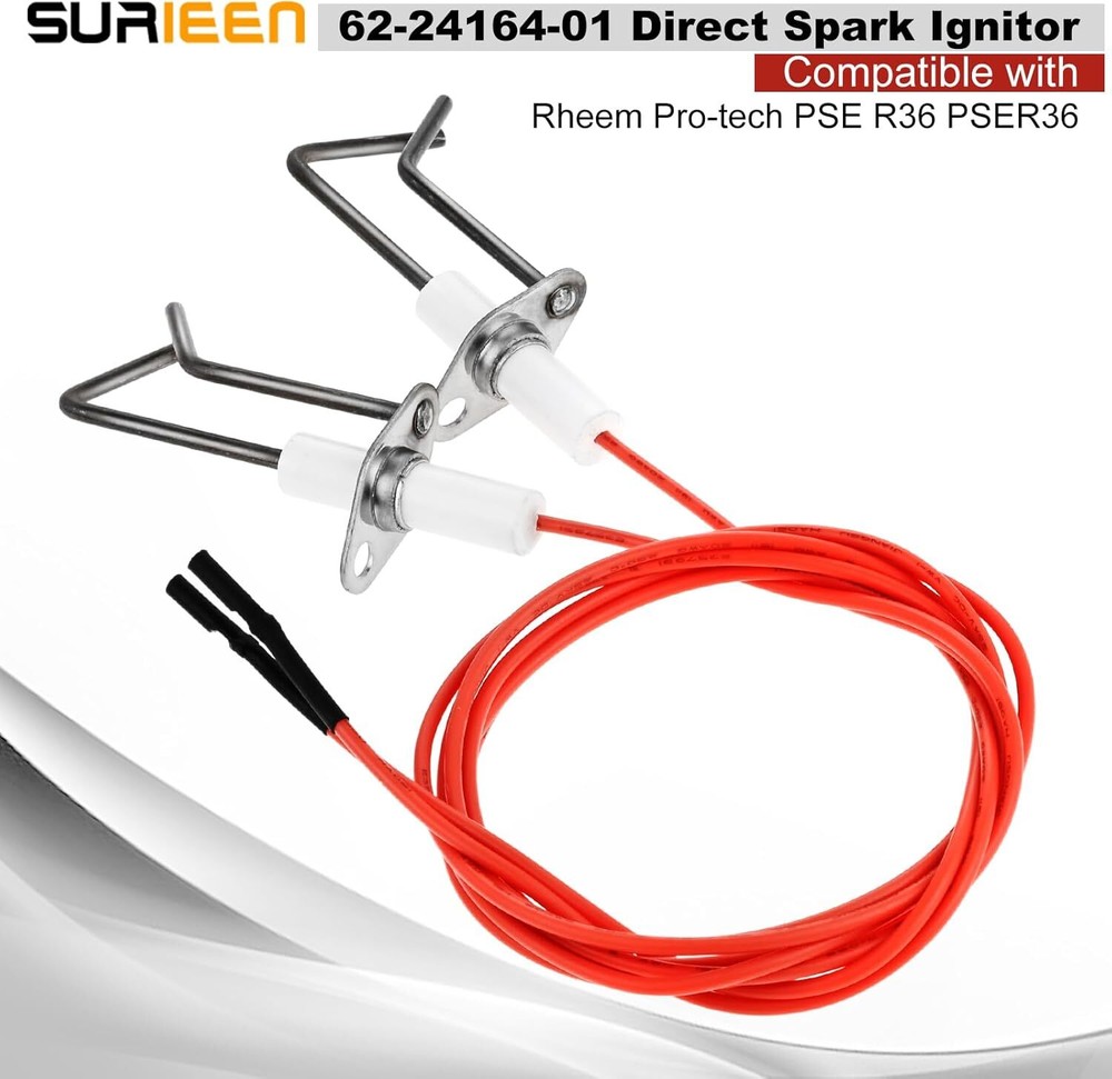 62-24164-01 Flame Sensor Igniter Sensing Rod, Compatible with Rheem Red Product Details Manufacturer: SURIEEN Part Number: 62-24164-01 Item Weight: 2.11 ounces Product Dimensions: 3.82 x 3.15 x 1.14 inches Item model number: 62-24164-01 Color: Red Mounting Type: Flange Mount Batteries Included?: No Batteries Required?: No Brand: SURIEEN Color: Red Mounting Type: Flange Mount Is Electric: Yes Manufacturer: SURIEEN MaterialStyle: CeramicIndoor Installation 【Premium Quality】This Furnace Burner Igniter is made of premium alloy material. This alloy is characterized by high electrical resistivity and good oxidation resistance. DIY Ignition Parts with Double Sparker and 33.5inch 480°F Resistance High Temperature Cable. 【Replace Part Number】Direct Spark Ignition Ignitors Replacement for model 62-24164-01 Flame Sensor Igniter Sensing Rod of Rheem Furnace Include two sets and replacement for Suburban 232258 2-Prong Electrode Assembly. It is high efficiency spark kit with two sparking for fireplace, fire pit , furnace etc. 【Wide Application】This can be universal kit if you can adjust the height of spark pin in right posistion. The two pin will increase the power during spark and higher efficiency igniting. Suitable for RV furnaces, water heaters, indoor and outdoor kitchens, cooktops, ranges and ovens etc. 【Easy Installation】The Direct Spark Ignitor is easy to use. Remember to shut off the power to your furnace (or any other appliance), then remove the broken Sensor and replace it with our new sensor. Turn the power back on, Check the Results. 【What You Get】The pacakge include 2pcs Flame Sensor Igniter with small rubber cables. If you have any questions, simply contact us to get a replacement or refund. We provide friendly 24/7 customer service.