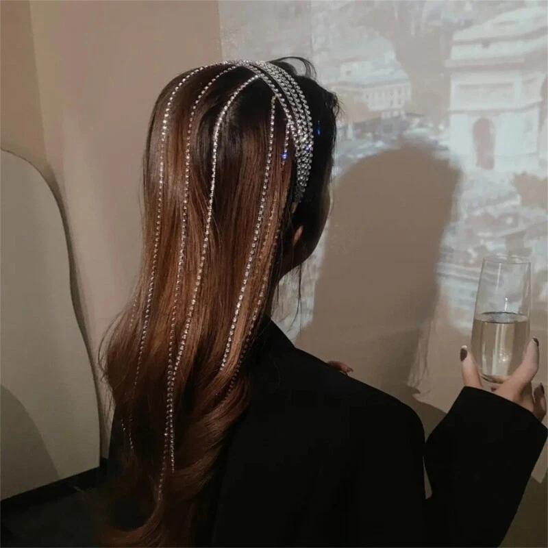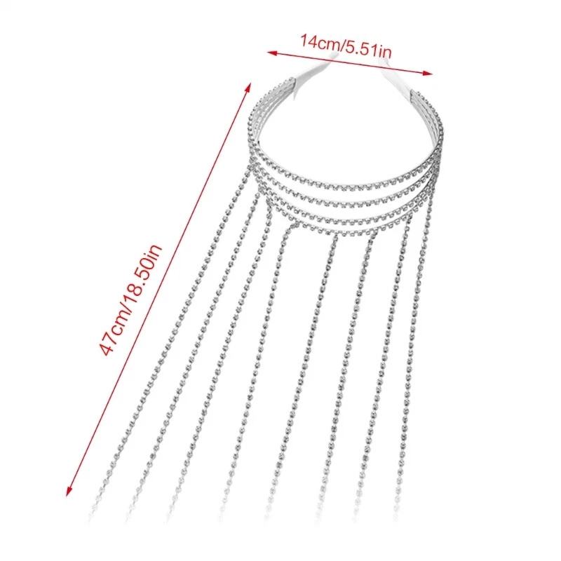 Features: Rhinestones Tassel Headband,Hair Chain Headband,Rhinestones HeadChain ,Rhinestones Tassel Hair Accessories,bling rhinestones hair chain, Hair Chain Tassel, Hair Chain Accessories Jewelry,Rhinestones Hair Rope Durable alloy and bling crystal, while putting the headwear during sunshine and lights, it gives a beautiful colorful reflection. Bling rhinestones headband makes you look like wearing long tassel hair chain.Styling hairpieces with multi rhinestones chains, easy to design your hairstyle. Even simple ponytail and braids, just wrap the chain around your hair, helping you stand out from the crowd. Proper size with suitable elasticity, multirow of rhinestones make it look delicate, sturdy enough to secure hairs, will not slip off easily, and its lightweight will not add burden on your forehead. Glitter rhinestones hair hoops can be applied on various occasions, like weddings, parties, ceremonies, Christmas, Halloween, birthdays, banquets, and daily wearing. Specifications: Material:Alloy Color:Silver Size: Approx.Headband width 14cm/5.51in,total length 47cm/18.50in Package Includes: 1xRhinestones Tassel Headband note: Please allow 1-2cm errors due to manual measurement, make sure that you do not mind before you order.Due to the difference between different monitors, the picture may not reflect the actual color of the item.