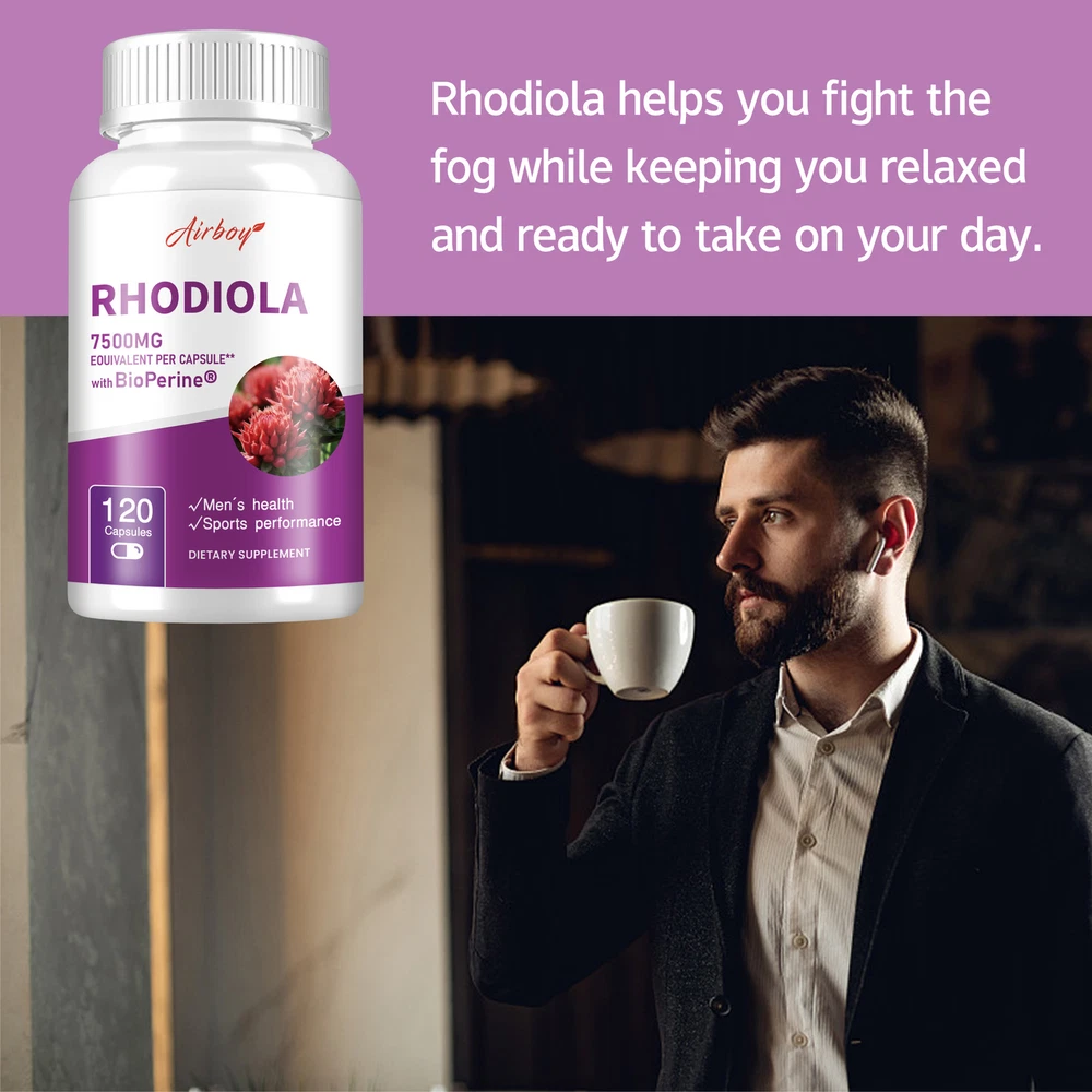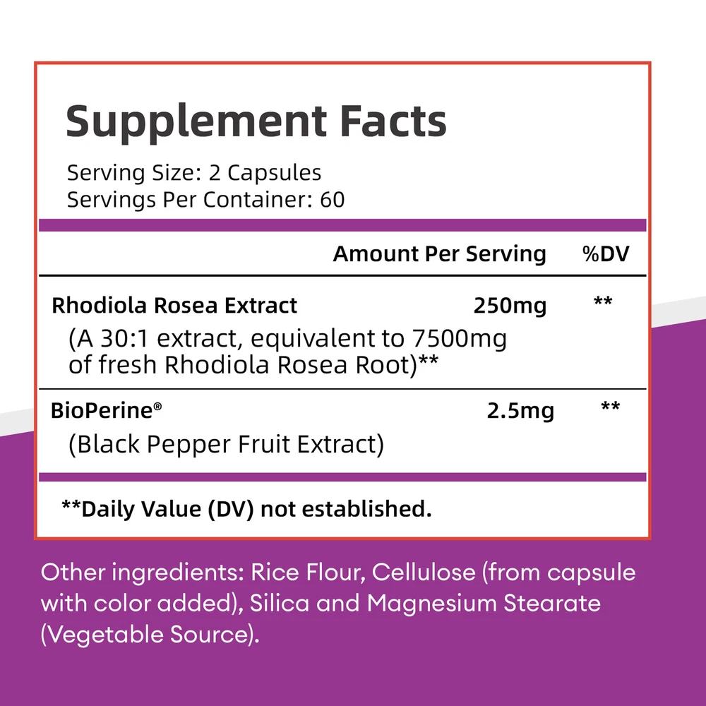 Effects: Energy & Endurance, Men's Health, Testosterone Booster Ingredients: Rhodiala Root Directions: Take 2 capsules once daily after a meal. Shipping: Ships within 48 hours on working days. Shelf life: 2 years Description: Relieve Stress and Boost Your Mood - Are you feeling brain fog, stressed, or exhausted? Rhodiola helps you fight the fog while leaving you relaxed and ready to take on your day. Whether you're having a busy day at the office, classroom, or home, Rhodiola can relax your mind while improving your focus, clarity, and mood. Boost Energy and Endurance - Looking for a clean boost of energy and mood? Our pure Rhodiola helps you stay focused and alert throughout the day so you can stay motivated, excel, and win the day. Rhodiola boosts immune support and defenses, stabilizing and maintaining your body and overall health to help you live a balanced, healthy life. Vegetarian & Non-GMO - Rhodiola is vegan, non-GMO, and gluten-free. Document