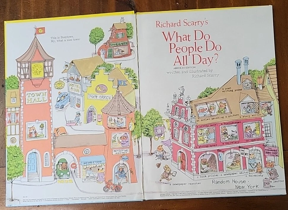 This is a vintage picture book titled "Richard Scarry's What Do People Do All Day?" by Richard Scarry. It was published in 2015 by Random House Children's Books and has 96 pages. The book is intended for ages 2-8 and features animals and transportation concepts. It weighs 26.1 ounces and measures 12.2 inches in length, 10.5 inches in width, and 0.5 inches in height. Some imperfect to outside shown in photo but the pages are all great . Awesome book .
