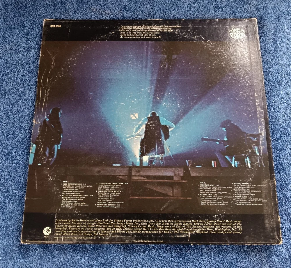 This is the LP Alarm Clock by Richie Havens. It is from 1970 and is on Stormy Forest. The record is in EX condition. The cover is in VG condition with a fair amount of wear, ring wear and edge wear. The songs are: Here Comes The Sun To Give All Your Love Away Younger Men Grow Older Girls Don't Run Away End Of The Seasons Some Will Wait Patient Lady Missing Train Alarm Clock Buyer to pay shipping and handling per the shipping calculator. We will ship worldwide.