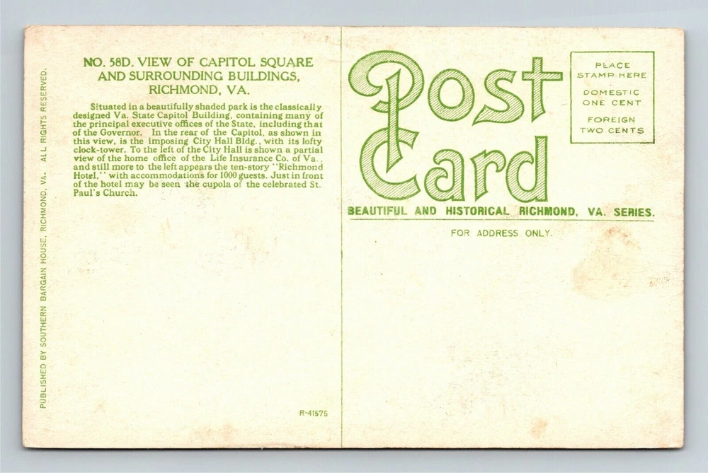 Original/Licensed Reprint: Original Country: See Detailed Scan Country/Region of Manufacture: Unknown Unit of Sale: Single Unit Theme: Cities & Towns City: See Detailed Scan Era: See Detailed Scan Region: See Detailed Scan Subject: See Detailed Scan State: Virginia Postage Condition: Unposted Circulated: Yes Type: Printed (Lithograph) City/Region: Richmond