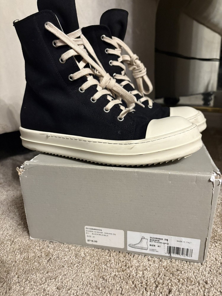 Black Rick Owens DRKSHDW zip fastening hightop canvas sneakers. These fashionable sneakers are gently used. This is a unisex shoe: Mens 8us / Womens 10us