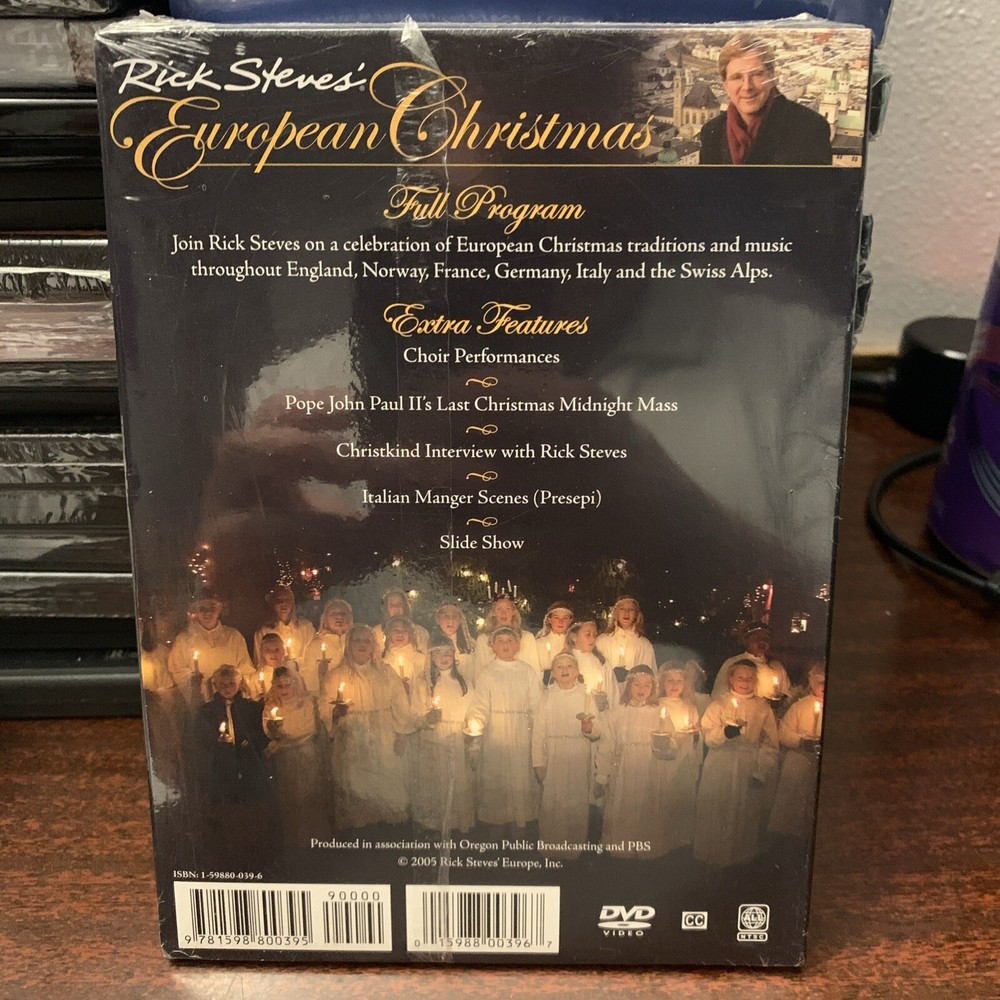 Rick Steves' European Christmas (DVD, 2005) New & Sealed Rick Steves' European Christmas DVD provides a vivid and authentic portrait of how Europeans celebrate the holiday from England to Norway, Burgundy to Bavaria, and Rome to the top of the Swiss Alps. Included are 14 complete live concert performances of music. The 2004 Midnight Mass at St. Peters Basilica (Pope John Paul II) is featured with highlights of Christmas traditions up in the loft with the finest choirs, and into the kitchen with grandma and her best-kept holiday secrets. Approximate runtime: 56 minutes