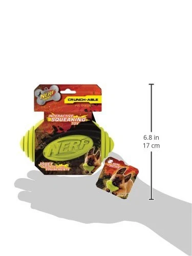 Product Description Down. Set. Hut!!! It’s game day every day with the Squeak Football. Perfect for a pick-up game in the backyard with your favorite mutt, this football is constructed from extra strength interactive rubber and features a gripped design to make it easy for humans to toss and dogs to catch. squeeze is all you need to hear that squeaker sound that dogs love! The Nerf-quality materials make this dog toy lightweight and durable so it’s great for indoors and outdoors. It’s made of water-resistant, 100% non-rubber so it's safe for pets and it’s the perfect toy you can take to the park, beach or lake, too. When it gets dirty from outdoor play, simply rinse or wipe off and it's good to go! From the Manufacturer Dogs will love to squeak and shake their brand new Squeaker football! This high performance dog toy is designed for demanding use by both you and your pet. It features a high bounce, high buoyancy, high visibility and high durability. The Ridged Squeaker Football is a durable rubber, interactive toy. 6 inches long. Available in various colors. NERF-TOUGH: Nerf-quality materials make our Ridged Squeaker Football perfect for fetch and for teaching your dog new tricks HIGH VISIBILITY: The bright green football is easily trackable for both you and your pet, no matter where or how far you toss it MADE TO LAST: Lightweight, durable, and weather & water resistant FOR MEDIUM AND LARGE BREEDS: With a 7 inch diameter, this football is ideal for medium and large breeds SAFETY FIRST: Designed with your dog's safety in mind, each of our dog toys are tested to ensure endless hours of family fun