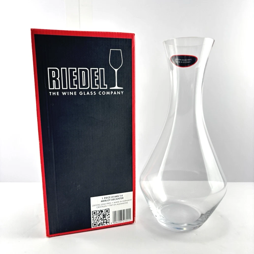 This is a RIEDEL Merlot Decanter made of crystal, lead-free, and crafted in Germany. The decanter is clear in color and comes in an open box. It is designed specifically for Merlot wines, featuring a sleek and elegant design perfect for aerating and serving wine.