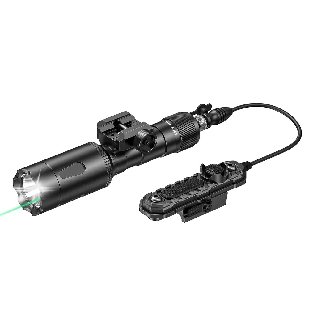 【HIGH BRIGHTNESS】The tactical gun flashlight delivers 1000 Lumens 332m distance beam. According to strict quality testing, the flashlight can run for up to two hours in laser+light mode, powered by 2 pcs CR123A Batteries. 【GREEN LASER LIGHT COMBO】- 3 selectable settings: laser only, flashlight only, laser & flashlight. You can precisely aim your target easily day or night. Class IIIA laser; less than 5mW. (If you notice any stray light around the emitted laser, please unscrew the lamp head to clean the lamp cup and glass plate.) 【3 LIGHT MODES】- The tactical laser flashlight offers constant, strobe, and momentary modes for inpointing or disorienting your focused target. Momentary works with the remote switch only. 【MULTIFUNCTIONAL TAILCAP】- Integated tail switch with compatible connecting remote pressure switch, operation with ease & quick. Remote switch included. NOTICE: The remote switch can only be used when the rotary button is in OFF status. 【DURABLE】- Anodized aluminum construction, the rail mount gun flashlight reaches IPX4 waterproof and 1 meter impact resistance. Size: 6.1x1.4 inch, fits on 20mm MIL-STD-1913 standard Picatinny Rail. 【RELIABLE AND STURDY】- The upgraded rail system with rotate-to-fix wheel, can be installed and removed with one hand. It improves reliability and sturdiness than the traditional screw guide, which can effectively resist the recoil and prevent the Ar flashlight from falling. 【WIDELY USED】The long gun flashlight can be used for home/personal defense, rescue, outdoors like hunting, hiking.