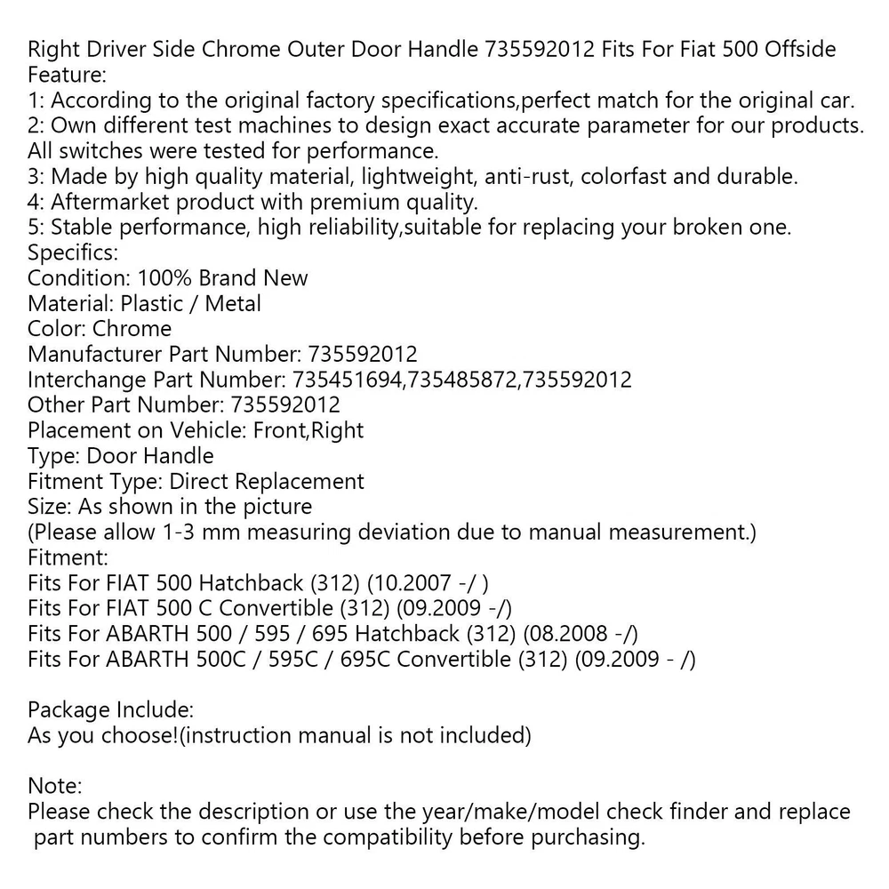 6L80 6L90 Transmission Rebuild 1-2-3-4 3-5-Reverse Clutch Seals Pack O-Rings 20.89 USD 21.99 USD Free shipping 5% off For Peterbilt Door Latch Striker R56-6017 16.57 USD Free shipping ABS Anti-Lock Brake Pump Assembly 57110-T2F-L22 for Honda Accord Sport 2.4L 2014 553.65 USD 582.79 USD Free shipping 5% off Clutch Cable For Honda CBR900 CBR954 Fireblade 2002-2003 CBR929 2000-2001 UE UE 16.27 USD Free shipping Rear Bumper Reflectors Fog Light Lamp Pair For Bmw 5Series F10 F18 2014 2015 U9 24.79 USD Free shipping Blind Spot + Heat Exterior Mirror Glass Left For Dodge Ram 1500 2500 2019-2022 26.87 USD Free shipping Chrome Fairing Saddlebag Light Accents Fit Honda Goldwing GL1800 2001-2011 47.3 USD 49.79 USD Free shipping 5% off Cylinder Head Cover Gasket for Yamaha VMX12 V-Max1200 88-07 XVZ1200 26H-11193-00 24.73 USD 26.03 USD Free shipping 5% off Front Sprocket Nut Lock Washer Tab Kit For YAMAHA R6 YZF 600 1000 TDM 850 14.95 USD 16.79 USD Free shipping 11% off Radiator Cooling Engine Cooler For Kawasaki ZX-6R ZX636 2024-2025 Black 157.79 USD 200.41 USD Free shipping 21% off Oil Cooler Filter Housing Seal Gasket O-ring 21304-JA11A For Nissan Armada Titan 10.68 USD Free shipping 2x Intake Manifold Boot Flange for Polaris Indy Trail 488 500 86-00 3085044 U.S 28.79 USD 30.31 USD Free shipping 5% off A Fantastic Shop Send us a message Our Store Seller Profile Feedbacks Save this seller Contact Right Driver Side Chrome Outer Door Handle 735592012 Fits For Fiat 500 Offside Right Driver Side Chrome Outer Door Handle 735592012 Fits For Fiat 500 Offside Feature: 1: According to the original factory specifications,perfect match for the original car. 2: Own different test machines to design exact accurate parameter for our products.All switches were tested for performance. 3: Made by high quality material, lightweight, anti-rust, colorfast and durable. 4: Aftermarket product with premium quality. 5: Stable performance, high reliability,suitable for replacing your broken one. Specifics: Condition: 100% Brand New Material: Plastic / Metal Color: Chrome Manufacturer Part Number: 735592012 Interchange Part Number: 735451694,735485872,735592012 Other Part Number: 735592012 Placement on Vehicle: Front,Right Type: Door Handle Fitment Type: Direct Replacement Size: As shown in the picture (Please allow 1-3 mm measuring deviation due to manual measurement.) Fitment: Fits For FIAT 500 Hatchback (312) (10.2007 -/ ) Fits For FIAT 500 C Convertible (312) (09.2009 -/) Fits For ABARTH 500 / 595 / 695 Hatchback (312) (08.2008 -/) Fits For ABARTH 500C / 595C / 695C Convertible (312) (09.2009 - /) Package Include: As you choose!(instruction manual is not included) Note: Please check the description or use the year/make/model check finder and replace part numbers to confirm the compatibility before purchasing. About US About Our Items We strive to describe all items accurately and thoroughly, with the utmost care and attention to detail. However, to ensure a mutually satisfactory transaction, we kindly ask for your assistance in thoroughly reviewing the item description and photos, and addressing any questions before placing a bid. Customer Satisfaction We stand behind our commitment with exceptional service, a 100% money-back guarantee, and a dedication to customer satisfaction. I am readily available to address any inquiries or concerns you may have, both before and after your purchase. Our aim is to ensure your shopping experience is enjoyable and that you're delighted with your purchase. Feedback Your feedback is crucial to our business's success. If you're satisfied with your purchase and the service you received, we would greatly appreciate your positive feedback, along with an overall Detailed Selling Rating (DSR) of 5. Please take a moment to leave us positive feedback. Our eBay account is set up to automatically reciprocate positive feedback once yours is received. If you're considering leaving neutral/negative feedback or opening an eBay/PayPal case, we encourage you to reach out to us immediately. We're committed to resolving any issues to the best of our ability. Shipping Parcel will be shipped using Standard shipping method. For security purposes, items will be shipped exclusively to the confirmed address on Paypal. Please ensure your Shipping address is up to date before proceeding with payment. Estimated delivery time within the United States ranges from 3 to 10 business days, depending on your location. Returns We accept returns within 60 days from the date the buyer receives the item. If the item is found to be defective upon receipt, the customer has up to 30 days from the date of receipt to request an exchange for a new item or a refund. For returns due to a change of mind, we accept items in their original selling condition. However, if the package has been opened due to a mistaken order, it does not qualify for our return policy. Please note that the buyer is responsible for covering the cost of return postage. If you encounter any issues, please reach out to us via eBay message, and we'll respond within 24 hours. White Front Left Ouside Door Handle Key Cover Cap 69218-53021 For Lexus IS250 11.79 USD Free shipping Front Left Driver Exterior Door Handle 82651-D9710 For Kia Sportage 2017-2021 24.87 USD Free shipping Chrome Front Left Cap Door Handle Key Hole Cover 4H1837879B For AUDI A6 A7 12.46 USD Free shipping 4PCS Exterior Door Handle For Ford Super Duty F250 F350 1999-16 120.87 USD Free shipping Right Outside Door Handle 82661-D9710 For Kia Sportage 2017-2021 25.87 USD Free shipping Black Exterior Rear Left Door Handle 51217231933 For BMW F10 F01 F02 F06 F11 M2 44.79 USD Free shipping Rear Left Driver Side Handle Cover 83652C5010 For Kia Sorento 2016-2020 13.64 USD Free shipping Front Left Passenger Side Door Handle Carrier 51218243615 For BMW X5 E53 00-06 Y 49.79 USD Free shipping 4PCS Exterior Door Handle For Silverado Sierra 2014-2018 62.87 USD Free shipping Front Right Driver Side Door Handle 