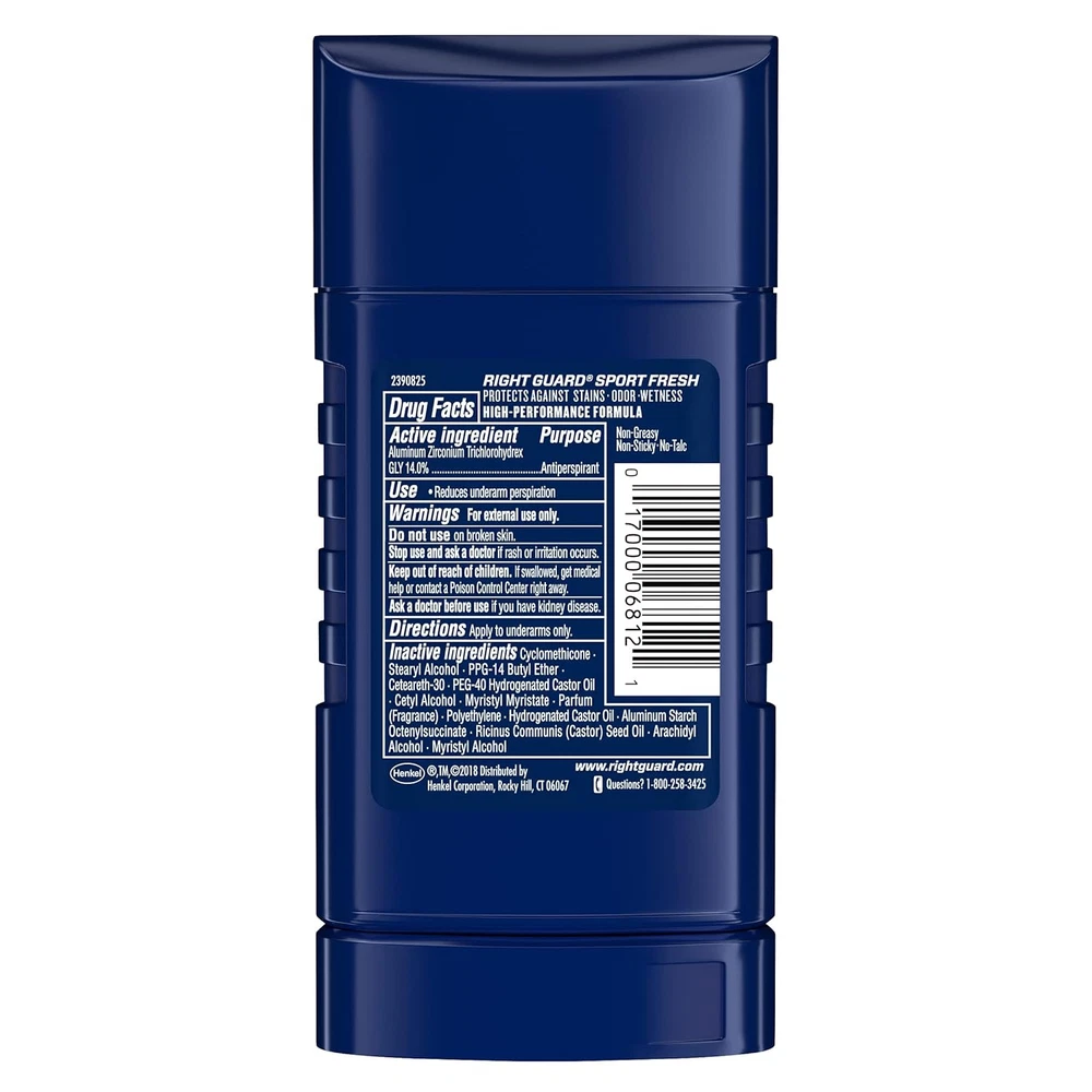 Product Description When we make Right Guard brand, we don't fool around, at least around the beakers and flammables. Science! In fact, we‰۪re totally committed to destroying embarrassing odor and wetness. This is more than a list of ingredients. It‰۪s total confidence in how you look, smell and feel. You know that guy in the stands that is confident enough to start the wave even when your team is down by 30 that could be you. With up to 48-hours of sweat, odor, and stain protection, Right Guard Sport has you protected. So, go ahead and throw your arms in the air. Lasting protection: right guard sport deodorant with lasting protection from odor for up to 48 hours Won’t stain or discolor clothes: a men’s deodorant that defends against yellow stains on clothing High performance formula: dermatologist tested, non-greasy, and non-sticky Free from: this deodorant was designed to be free from aluminum, alcohol, talc and parabens. Fragrance: range of crisp, fresh scents that keep you feeling refreshed with Range of crisp, fresh scents that keep you feeling refreshed All day protection: provides long-lasting protection from sweat and odor Dermatologist-tested formula Right guard deodorant sticks. Country of origin is united states Defends against yellow stains on clothing Dermatologist tested formula Sweat blockers Odor lockers Fresh scent Ingredients Cyclomethicone, Stearyl Alcohol, PPG-14 Butyl Ether, Ceteareth-30, PEG-40 Hydrogenated Castor Oil, Cetyl Alcohol, Myristyl Myristate, Parfum (Fragrance), Polyethylene, Hydrogenated Castor Oil, Aluminum Starch Octenylsuccinate, Ricinus Communis (Castor) Seed Oil, Arachidyl Alcohol, Myristyl Alcohol, Benzyl Salicylate, Linalool, Benzyl Alcohol, Coumarin, Citronellol, Butylphenyl Methylpropional