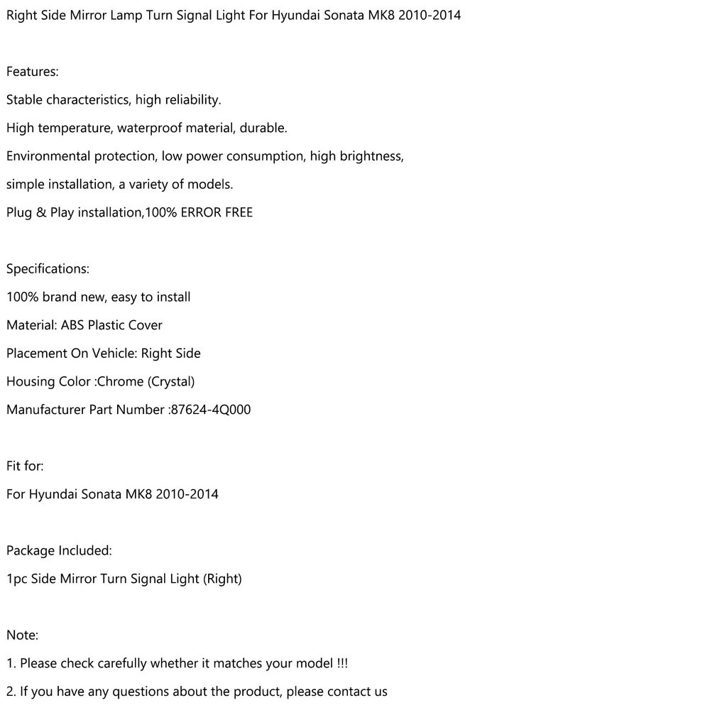 CNC Adjustable Kickstand Side Stand Fit HONDA CBR 600 1000 RR 600RR 1000RR 35.99 USD Free shipping 50x Small M5 5mm Motorcycle Fairing Spring Clips Speed Spire Nuts Clip U Nut 16.79 USD Free shipping ABS Anti-Lock Brake Pump Assembly 57110-T2F-L22 for Honda Accord Sport 2.4L 2014 582.79 USD Free shipping Air Filter Cleaner For Motorcycle Sportster 1200 Custom XL1200C Low XL883L USA 28.13 USD Free shipping Gbox Detent Kit for Porsche Transmission 996 997GT3 Boxster S Fixes 2ND Gear WR 18.99 USD Free shipping Traction Side Tank Pad Gas Knee Grip For Honda CBR1000RR 08-13 CBR600RR 03-06 ⏳ 11.87 USD Free shipping 0B5 DL501 Transmission Valve Body For Audi VW Porsche 629.99 USD Free shipping FUEL PUMP FUSE RELAY fit for Yamaha YZF R1 R6 FZ1 Fazer FZ8-N Naked 5VK-81950-40 28.99 USD Free shipping Pulsing Electrical Coil AM105573 AUC15118 For John Deere 325 335 345 425 445 455 24.92 USD Free shipping 6L80 6L90 Transmission Rebuild 1-2-3-4 3-5-Reverse Clutch Seals Pack O-Rings 21.99 USD Free shipping 116PCS Allen Screw & washer kit For Sportster XL 883/1200 2004+ Engine Covers 44.69 USD Free shipping 67mm Cylinder Jug Top End Piston Gaskets Kit for Yamaha YFM200 Moto 4 1985-1989 97.99 USD Free shipping A Fantastic Shop Send us a message Our Store Seller Profile Feedbacks Save this seller Contact Right Side Mirror Lamp Turn Signal Light For Hyundai Sonata MK8 2011-2015 YU Right Side Mirror Lamp Turn Signal Light For Hyundai Sonata MK8 2011-2015 Features: Stable characteristics, high reliability. High temperature, waterproof material, durable. Environmental protection, low power consumption, high brightness, simple installation, a variety of models. Plug & Play installation,100% ERROR FREE Specifications: 100% brand new, easy to install Material: ABS Plastic Cover Placement On Vehicle: Right Side Housing Color :Chrome (Crystal) Manufacturer Part Number :87624-4Q000 Fit for: For Hyundai Sonata MK8 2011-2015 Package Included: 1pc Side Mirror Turn Signal Light (Right) Note: 1. Please check carefully whether it matches your model !!! 2. If you have any questions about the product, please contact us About US About Our Items We strive to describe all items accurately and thoroughly, with the utmost care and attention to detail. However, to ensure a mutually satisfactory transaction, we kindly ask for your assistance in thoroughly reviewing the item description and photos, and addressing any questions before placing a bid. Customer Satisfaction We stand behind our commitment with exceptional service, a 100% money-back guarantee, and a dedication to customer satisfaction. I am readily available to address any inquiries or concerns you may have, both before and after your purchase. Our aim is to ensure your shopping experience is enjoyable and that you're delighted with your purchase. Feedback Your feedback is crucial to our business's success. If you're satisfied with your purchase and the service you received, we would greatly appreciate your positive feedback, along with an overall Detailed Selling Rating (DSR) of 5. Please take a moment to leave us positive feedback. Our eBay account is set up to automatically reciprocate positive feedback once yours is received. If you're considering leaving neutral/negative feedback or opening an eBay/PayPal case, we encourage you to reach out to us immediately. We're committed to resolving any issues to the best of our ability. Shipping Parcel will be shipped using Standard shipping method. For security purposes, items will be shipped exclusively to the confirmed address on Paypal. Please ensure your Shipping address is up to date before proceeding with payment. Estimated delivery time within the United States ranges from 3 to 10 business days, depending on your location. Returns We accept returns within 60 days from the date the buyer receives the item. If the item is found to be defective upon receipt, the customer has up to 30 days from the date of receipt to request an exchange for a new item or a refund. For returns due to a change of mind, we accept items in their original selling condition. However, if the package has been opened due to a mistaken order, it does not qualify for our return policy. Please note that the buyer is responsible for covering the cost of return postage. If you encounter any issues, please reach out to us via eBay message, and we'll respond within 24 hours. Left Corner Lights Turn Signal Lamps For Mercedes Benz C Class W202 1994-2000 20.86 USD Free shipping Left Corner Lights Turn Signal Lamps Fits Mercedes Benz C Class W202 94-2000 SA 24.98 USD Free shipping Right Corner Light Turn Signal Lamps Fits Mercedes Benz C Class W202 94-00 U9 23.79 USD Free shipping NEW Left Indicator Light Lamp Flasher Clear Lens 63136911719 for Mini Cooper USA 22.87 USD Free shipping Left Side Mirror Lamp Turn Signal Light For Hyundai Sonata MK8 2011-2015 H2 18.87 USD Free shipping NEW 1×Pair of Front Indicator Light Lamp Flasher Clear Lens for Mini Cooper USA 39.87 USD Free shipping Side Mirror Lamp Turn Signal Light Pair For Hyundai Sonata MK8 2011-2015 UE 26.79 USD Free shipping Front Right Indicator Light Lamp Flasher Clear Lens 63136911720 for Mini Cooper! 22.87 USD Free shipping Bumper Corner Light Turn Signal Lamp Kit Crystal Fits VW Passat B6 2010 Clear F8 34.87 USD Free shipping Right Corner Lights Turn Signal Lamps Fits For Bmw E46 2 Doors 1998-2001 23.99 USD Free shipping Right Corner Lights Turn Signal Lamps Fits Mercedes Benz C Class W202 1994-00 20.86 USD Free shipping Front Indicator Turn Signal Corner Clear Lights For BMW 3 Series E46 99-01 YU 43.87 USD Free shipping